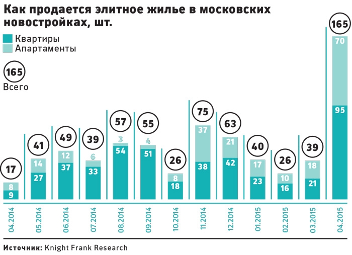 Такое число сделок за месяц стало историческим рекордом, уверена директор по работе с ключевыми клиентами департамента элитной жилой недвижимости Knight Frank Ольга Богородицкая. Прошлый был установлен в предкризисном апреле 2008 года, когда в Москве было продано 159 квартир в элитных новостройках, говорит она. Для сравнения: в апреле 2014 года, по данным компании, было продано только 19 премиальных квартир и апартаментов в новостройках, а за весь первый квартал этого года было заключено 99 сделок.