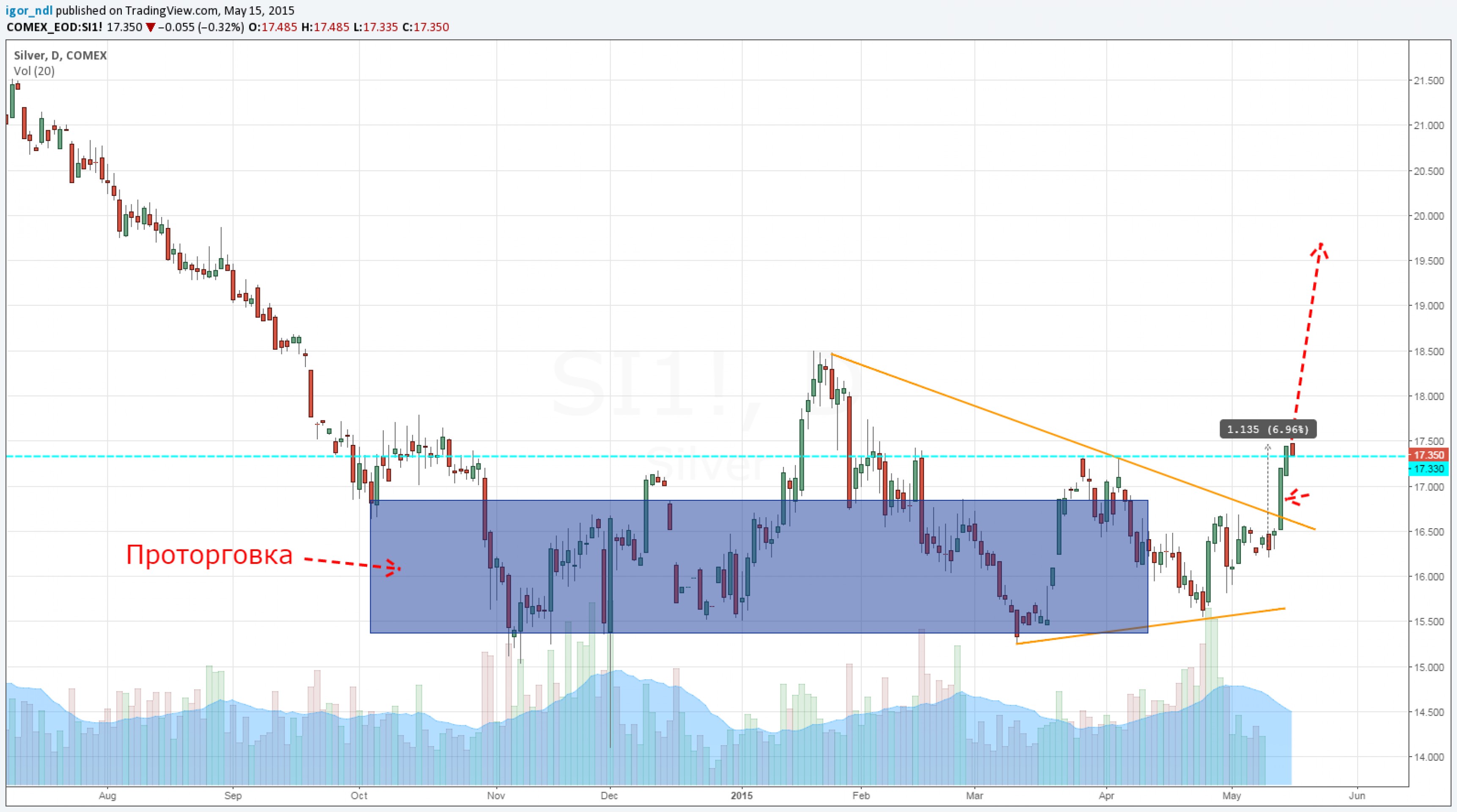 Участники рынка отмечают, что рост этот проходит на очень высоких объемах, а это может говорить о возможности формирования тренда. Что конкретно стало катализатором роста, эксперты сказать затрудняются. Называются такие причины, как падение доллара, слабые макроэкономические данные по США и ожидания включения юаня в корзину резервных валют МВФ. В таком случае, напомним, Поднебесная должна будет раскрыть данные по своим золотым запасам. Последний раз страна делала это в 2009 г. Схематично картина на рынке серебра выглядит примерно так: