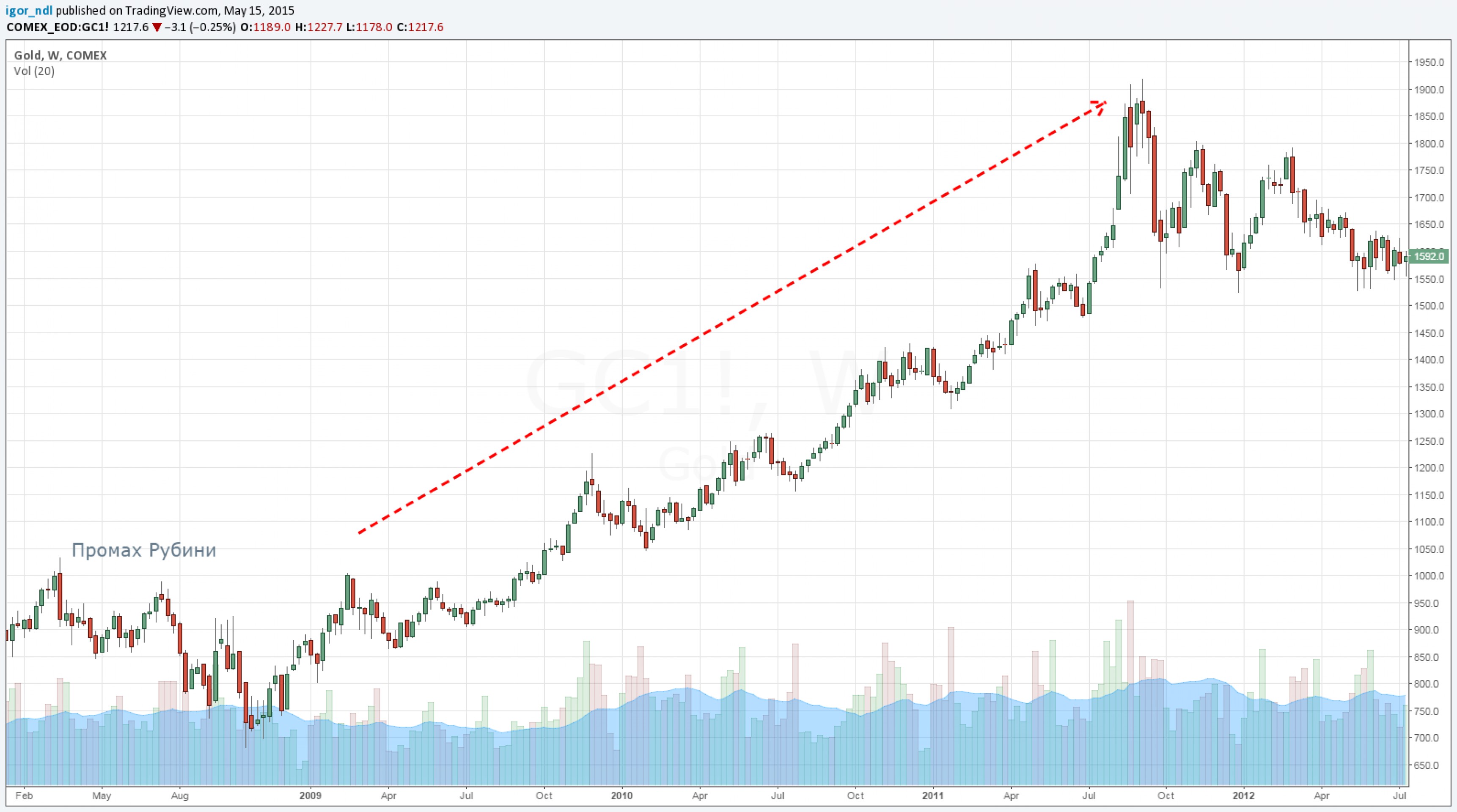 На самом деле, при определенном развитии событий, на рынке драгоценных металлов может сформироваться мощнейший по своим масштабам тренд. Проблема в том, что предсказывать этот рынок очень сложно. Даже, казалось бы, выдающиеся экономисты успели подмочить свою репутацию. Достаточно вспомнить промах Нуриэля Рубини в 2008 г., когда он предсказывал падение золота, и вот что вышло: