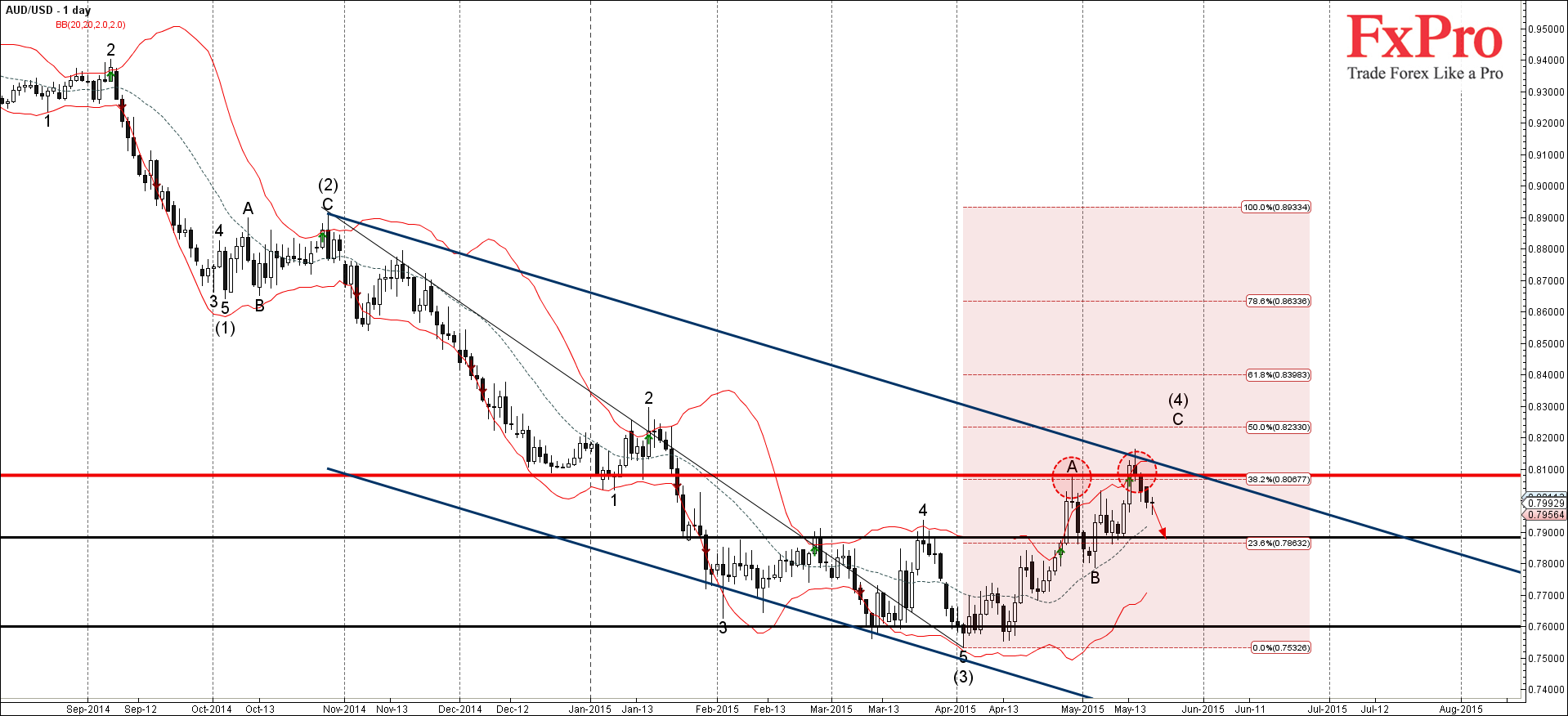 AUD/USD продолжает снижаться после недавнего разворота от сильной зоны сопротивления лежащей между уровнем сопротивления 0.8100 (который был установлен в нашем предыдущем прогнозе, как цель для роста этой пары и который развернул цену Вечерней Звездой в апреле), верхней дневной полосой Боллинджера и 38.2% коррекцией Фибоначчи предыдущего нисходящего импульса от октября.