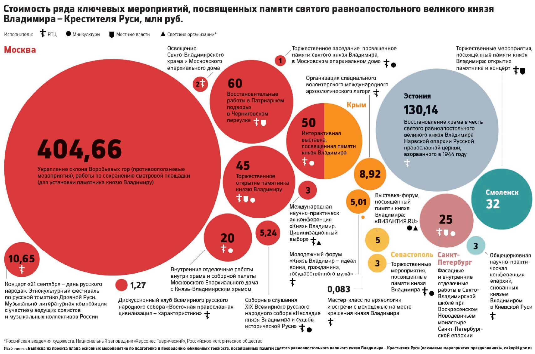 Но это не все средства: как показало исследование РБК, на установку памятников Владимиру и ремонт церквей из региональных бюджетов и спонсорами выделяются соизмеримые суммы, не указанные в данном распоряжении.