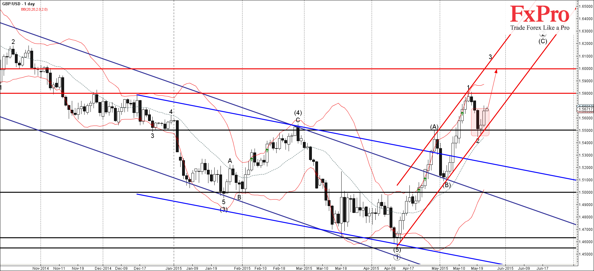 Нисходящая коррекция 2 от уровня сопротивления 1.5800 остановилась на сильном уровне поддержки 1.5500 (бывший сильный уровень сопротивления который развернул предыдущие волны (4) и (А)). Зона поддержки возле 1.5500 была усилена линией поддержки недавнего дневного восходящего канала от апреля.