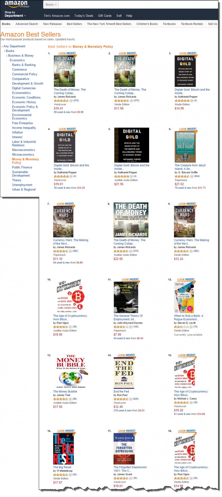 Так, раздел "Денежно-кредитная политика" на сайте Amazon.com представляет собой настоящий хит-парад книг, направленных против центробанков в целом, Федеральной резервной системы, в частности, а также против долларовой системы. Этот любопытный момент отметили авторы блога Zerohedge. Убедиться в этом совсем несложно: достаточно просто зайти на сайт интернет-магазина и увидеть все своими глазами.