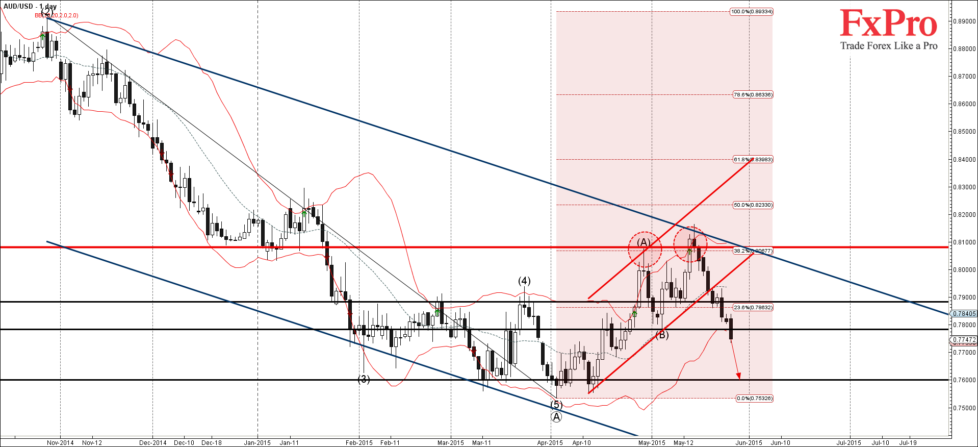 Прорыву уровня поддержки 0.7900 предшествовал прорыв линии поддержки дневного восходящего канала от апреля (как Вы можете видеть ниже). Этот двойной прорыв должен усилить медвежье давление на AUD/USD в ближайшее время.