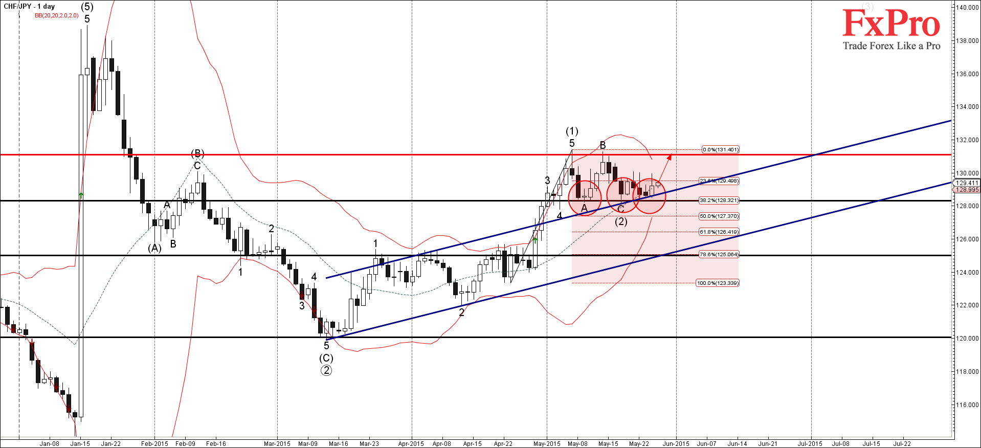CHF/JPY, скорее всего, продолжит расти к следующему цели для покупок на уровне сопротивления 131.00 (который развернул предыдущие среднесрочные волны (1) и В).