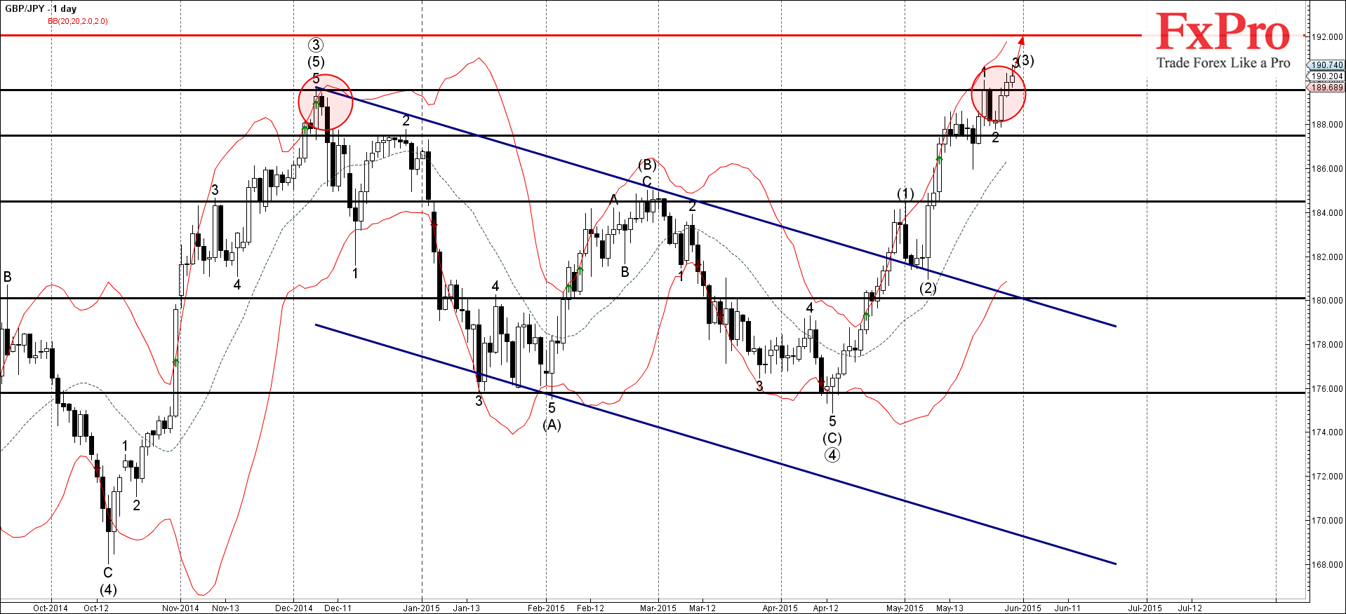 Цена недавно прорвала вышеупомянутый сильный уровень сопротивления 189.50 (который остановил резкую долгосрочную импульсную волну ③ в декабре, как Вы можете видеть на дневном графике GBP/JPY ниже).