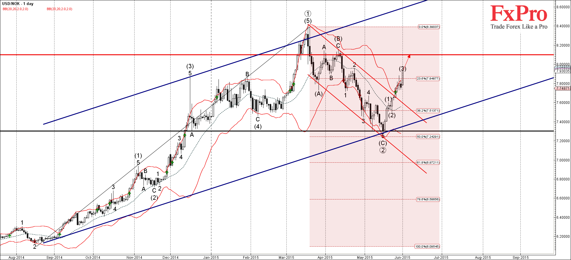 USD/NOK, скорее всего, продолжит расти к следующей цели для покупок на уровне сопротивления 8.1000 (который развернул предыдущие волны А и (B)).