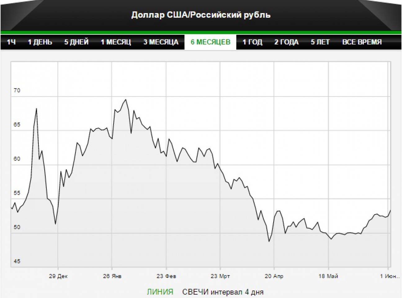 Рубль укреплялся с конца января 2015 г. - с отметки 67,8 до 49 в середине мая.