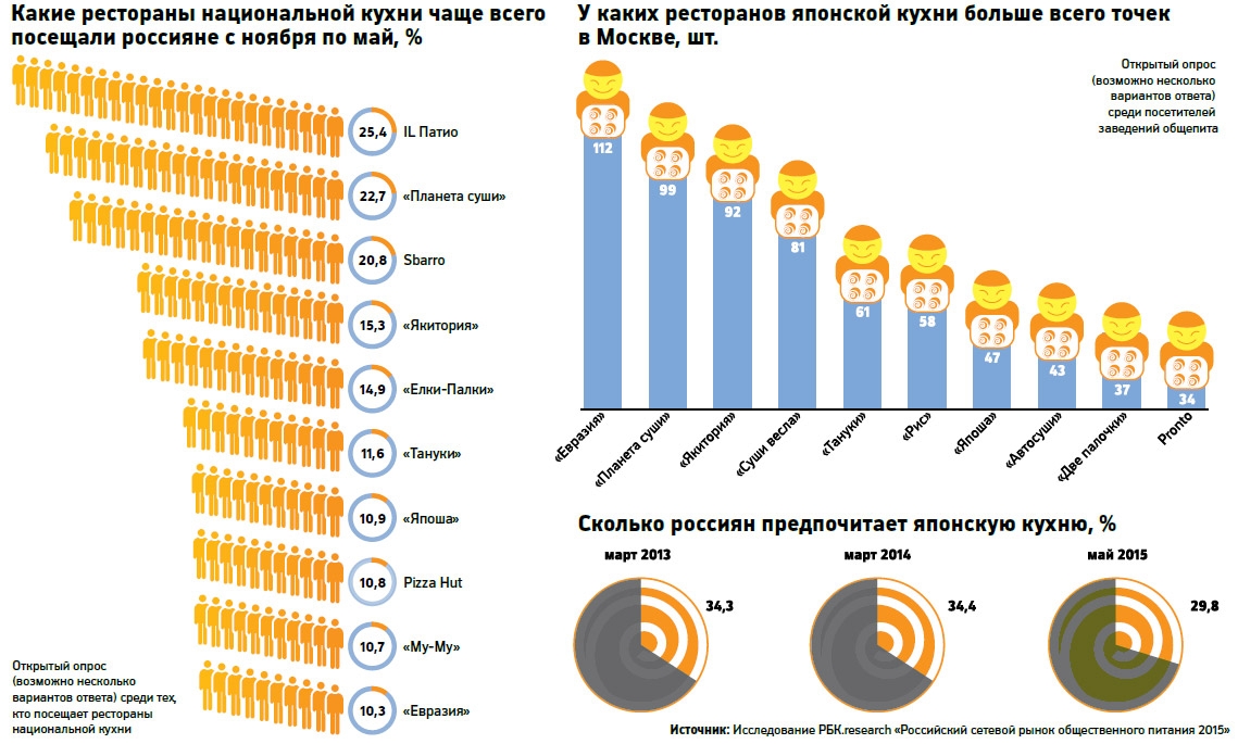 Сейчас японская кухня есть везде, даже в кофейнях и пиццериях, и потребитель от нее устал, говорит исполнительный директор консалтинговой компании Restcon Андрей Петраков. «У заведений японской кухни действительно есть проблемы, она стала менее интересной, явно виден спад. На него накладывается еще и падение потребительского спроса, из-за которого, независимо от кухни, закрывается много ресторанов», — уточняет он.