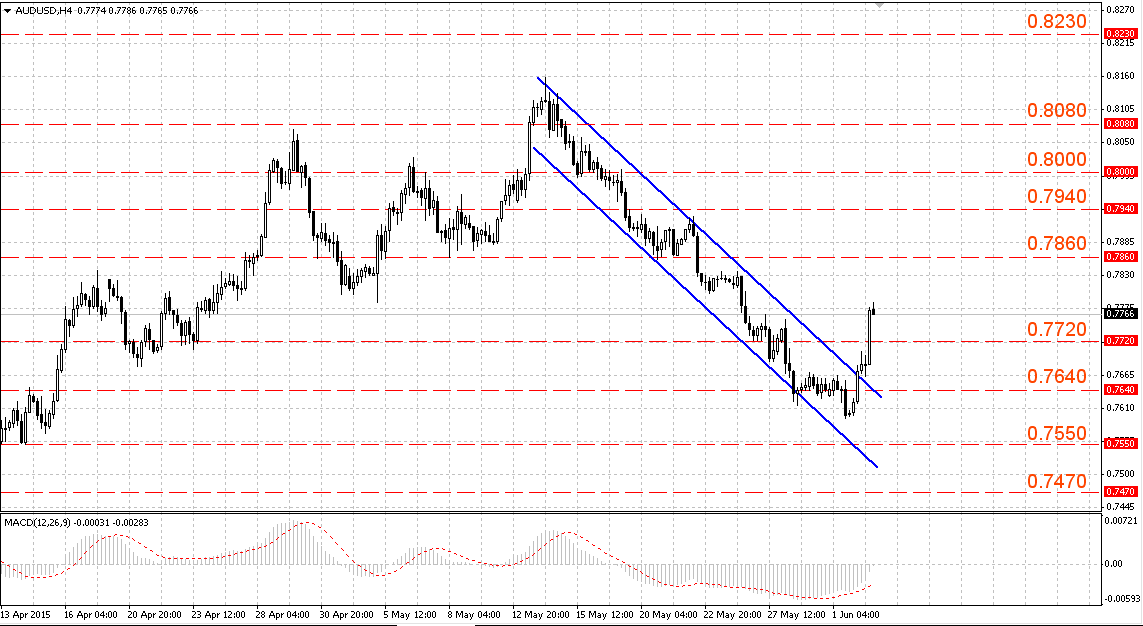 На протяжении нескольких недель доллар Австралии торговался в нисходящем тренде. На вчерашних торгах пара скорректировалась вверх. После выхода сильных новостей из Австралии быки пробили сопротивление в области 0.7640. Затем последовал резкий рост и пробой уровня сопротивления 0.7720.
