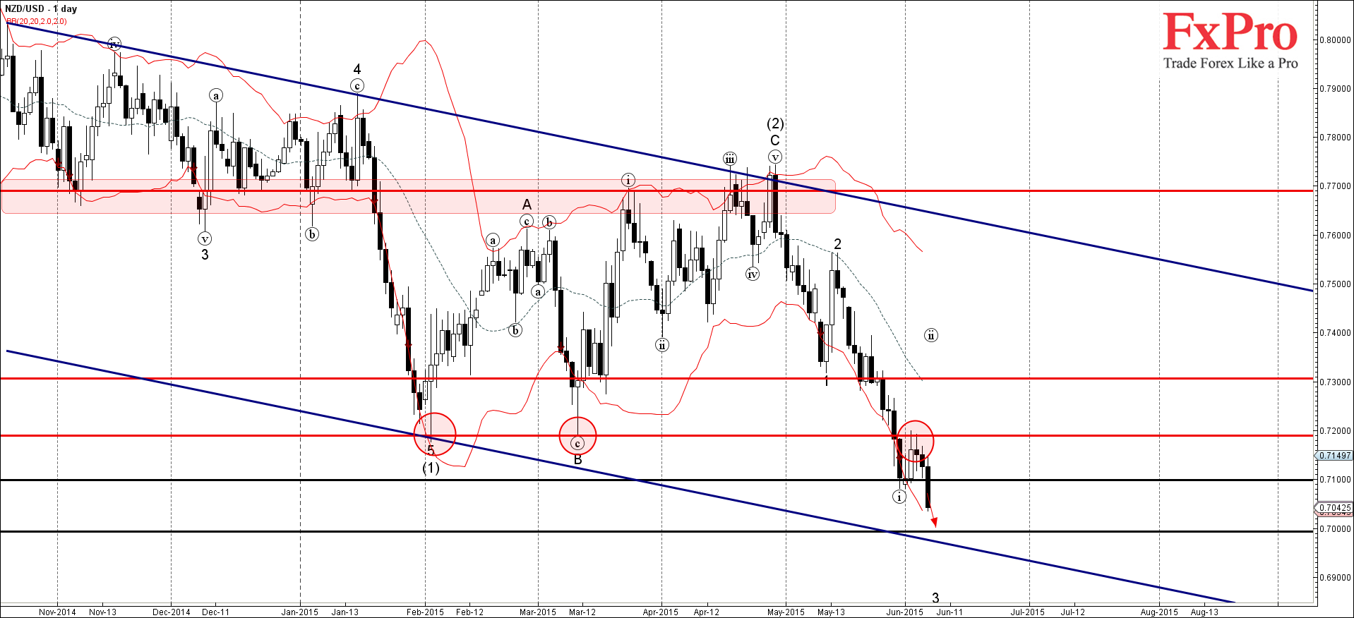 NZD/USD продолжает сильно падать после недавнего прорыва уровня поддержки 0.7100, который был установлен в качестве цели для продажи в нашем предыдущем прогнозе для данной валютной пары.