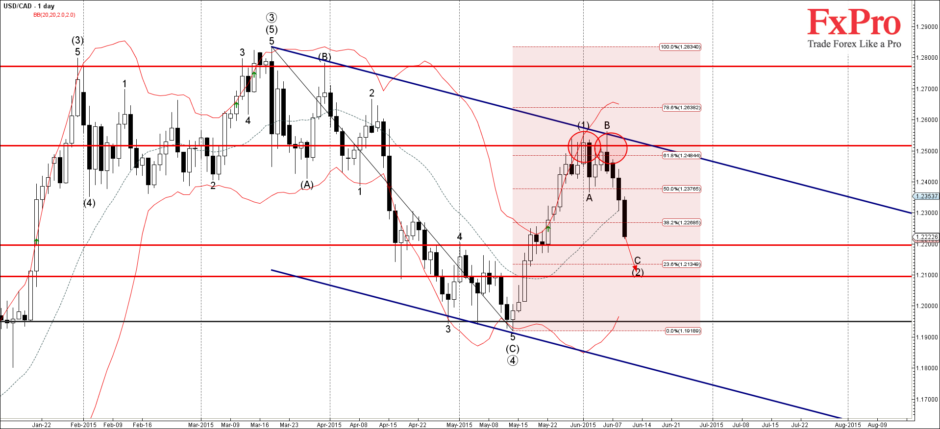 USD/CAD продолжает падение после недавнего разворота от сильного уровня сопротивления 1.2500 (который также ранее остановил резкий среднесрочный импульс (1)).