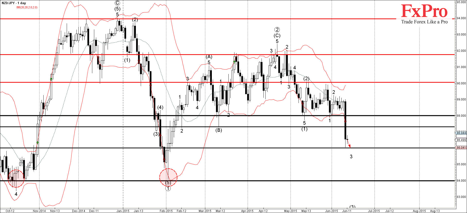 Прорыв уровня поддержки 88.00 усилил медвежье давление на NZD/JPY – что помогло цене прорвать следующий сильный уровень поддержки 87.30 (дно предыдущих волн 2 и (В)).