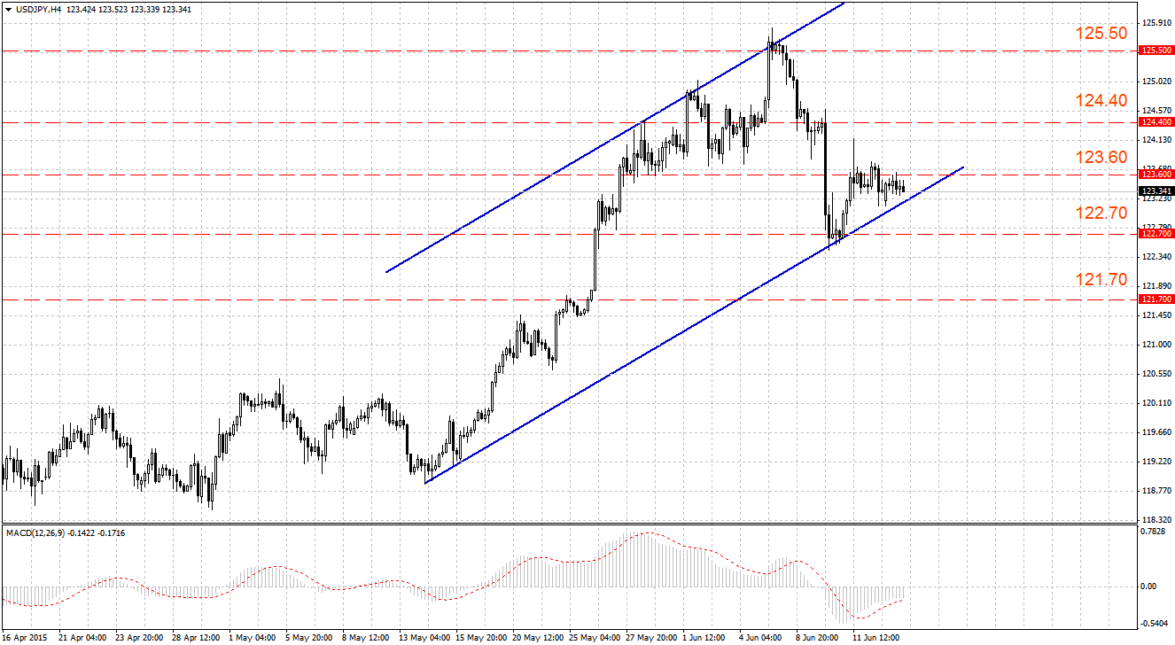 Пара USD/JPY торгуется в восходящем канале 123.20 – 126.00. Значимые уровни Фибоначчи для коррекции 23.6 (124.20), 38.2 (123.20), 50.0 (122.35).