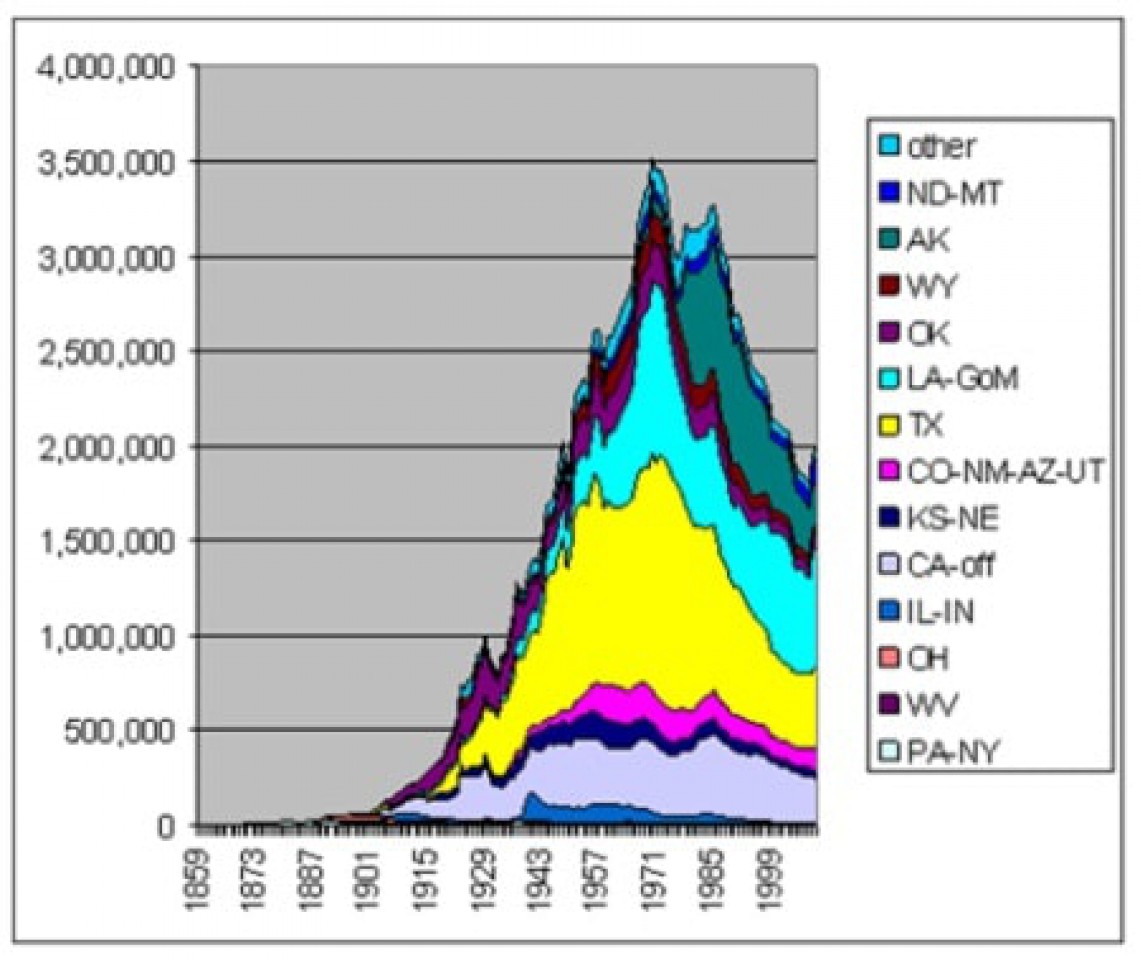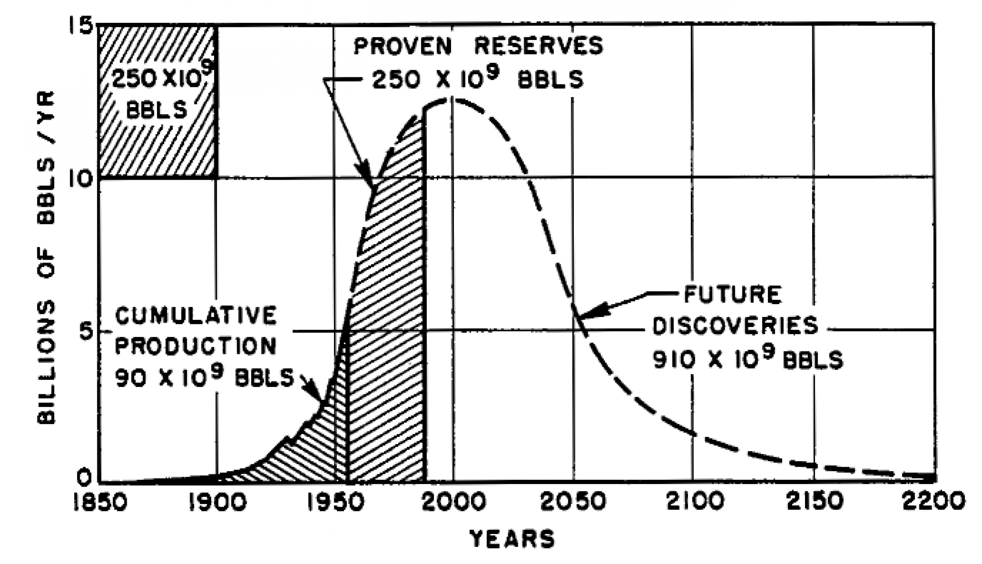 В 1956 г. геолог Кинг Хабберт сформулировал теорию, в которой предполагалось, что добыча нефти в США неизбежно достигнет точки, когда объемы добычи перестанут расти и начнут снижаться.