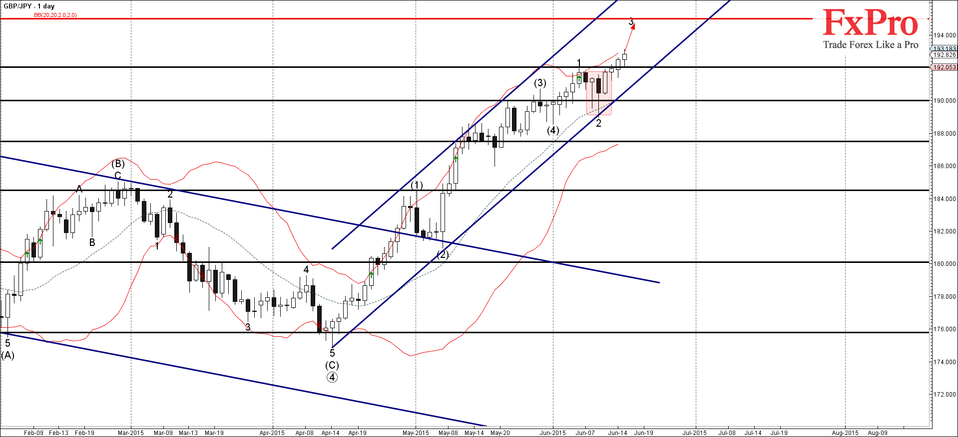 GBP/JPY, скорее всего, продолжит расти внутри краткосрочной импульсной волны 3 (среднесрочного импульса (5)) к следующей цели для покупок 195.00.
