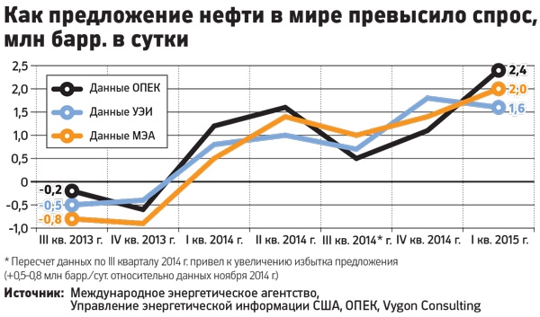 Последние три года добыча нефти в США росла в среднем более чем на 1 млн барр. в день за счет нового бурения в плотных породах. Даже сегодня при ценах чуть выше $60/барр. на нефть Brent ($55/барр. на нефть WTI) добыча по-прежнему продолжает увеличиваться. По оценкам международных агентств, с начала 2014 года растет избыток предложения; в первом квартале 2015 года он превысил 2 млн барр. в сутки, что должно подтолкнуть цены к снижению.