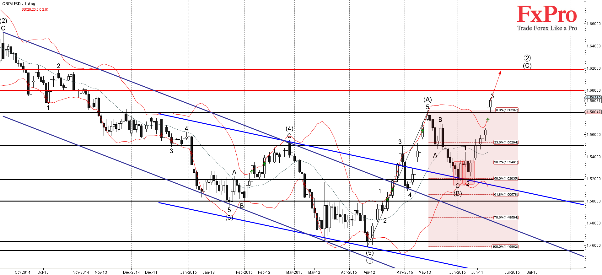GBP/USD недавно прорвал уровень сопротивления 1.5800 (вершина предыдущей (A)-волны и первая из двух целей для покупок, установленных в нашем предыдущем прогнозе для данной валютной пары - 1.5800 и 1.6000)