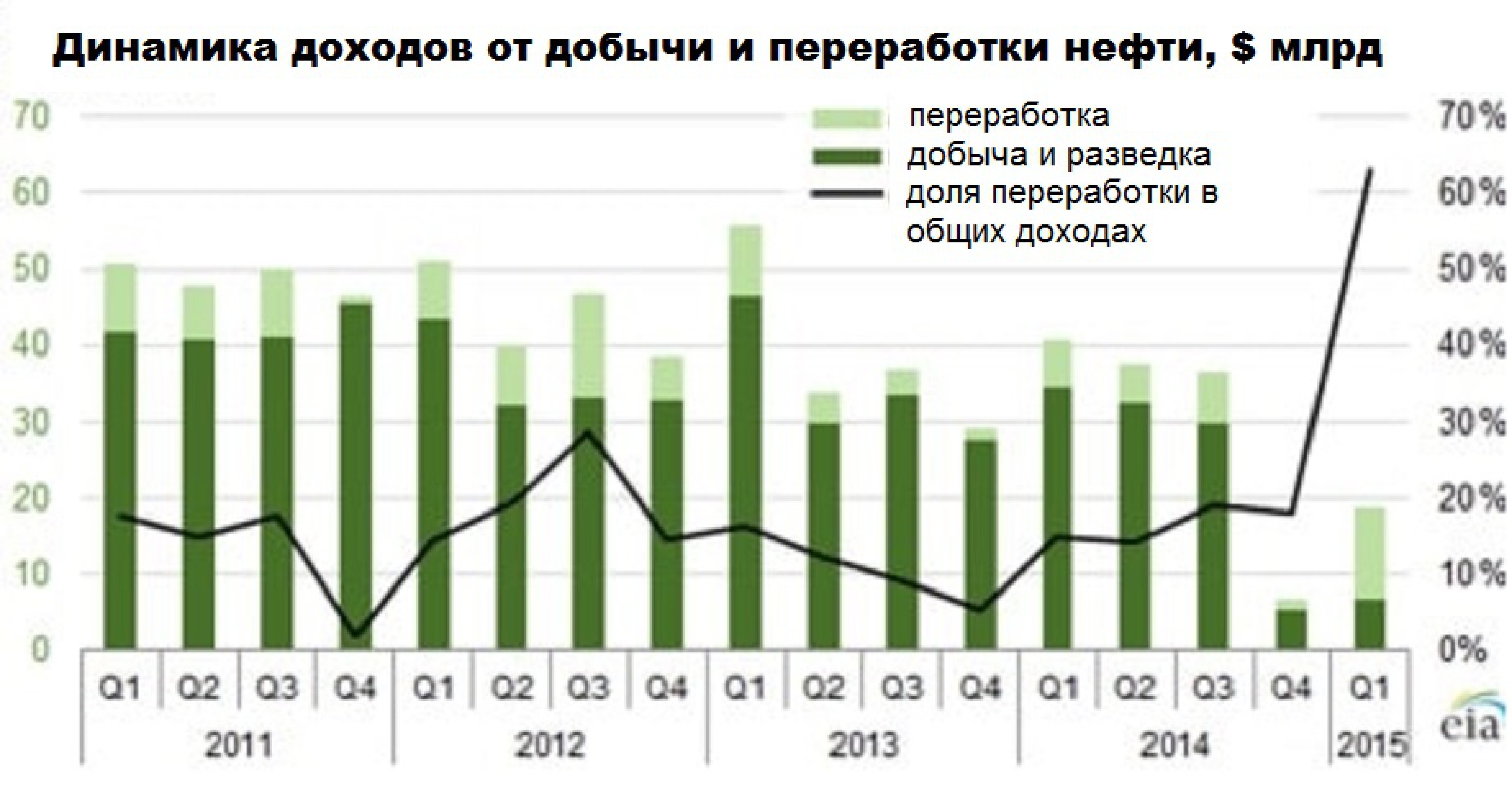 Согласно данным EIA прибыль крупных нефтяных компаний от подразделений по разведке и добыче упала на 80% в I квартале 2015 г. в годовом выражении, или на $28 млрд. Частично эти потери были компенсированы ростом на $6 млрд в виде прибыли от нефтепереработки, что предполагает 95%-й рост.