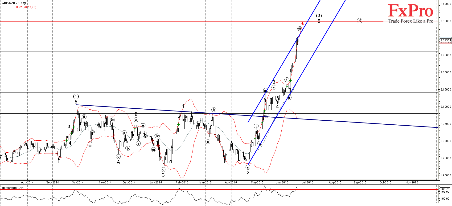 Учитывая, что дневной индикатор Momentum движется близко к годовым максимумам - GBP/NZD, скорее всего, продолжит расти внутри активной импульсной волны 3 к следующей цели для покупок 2.3500.