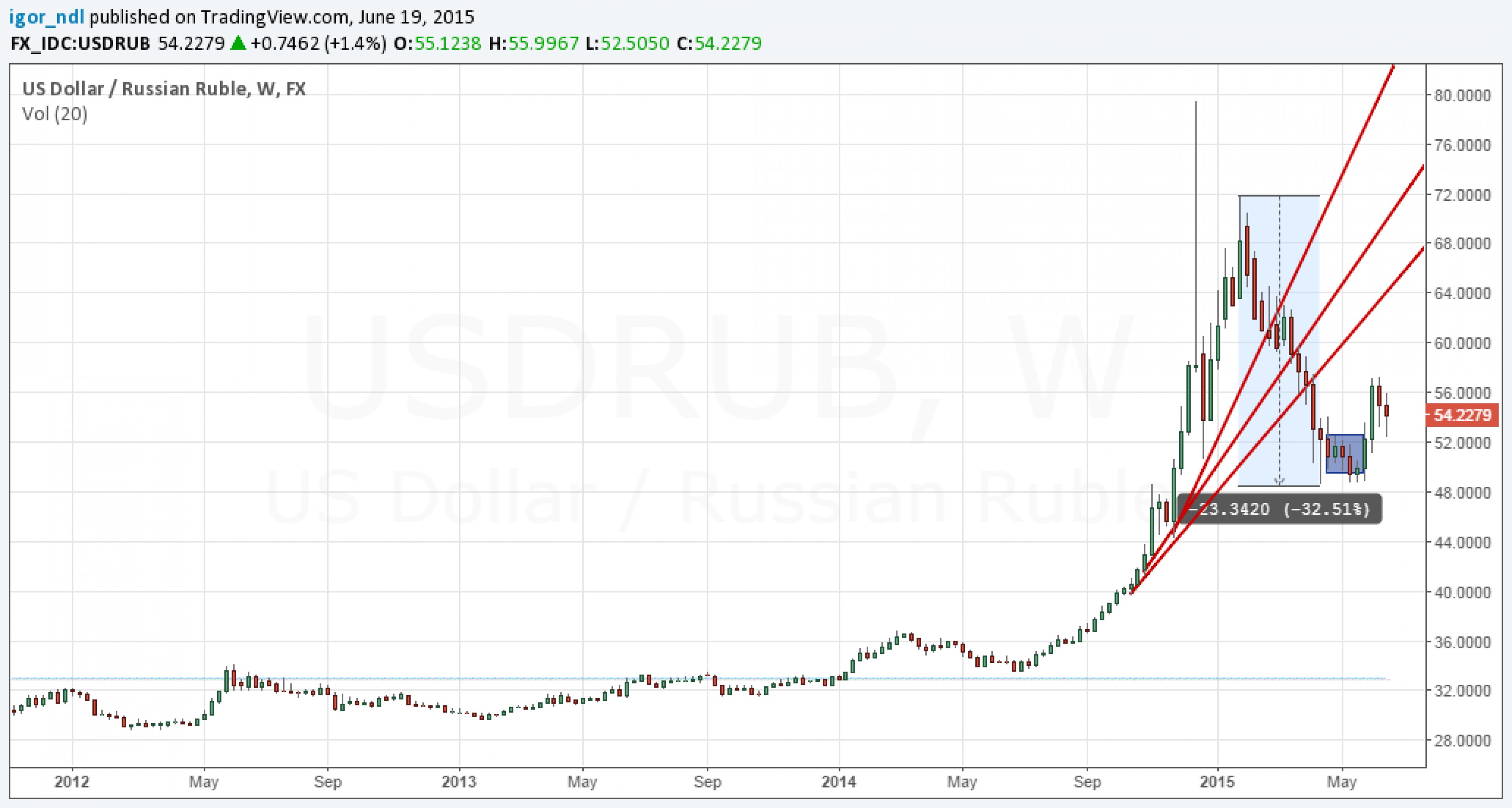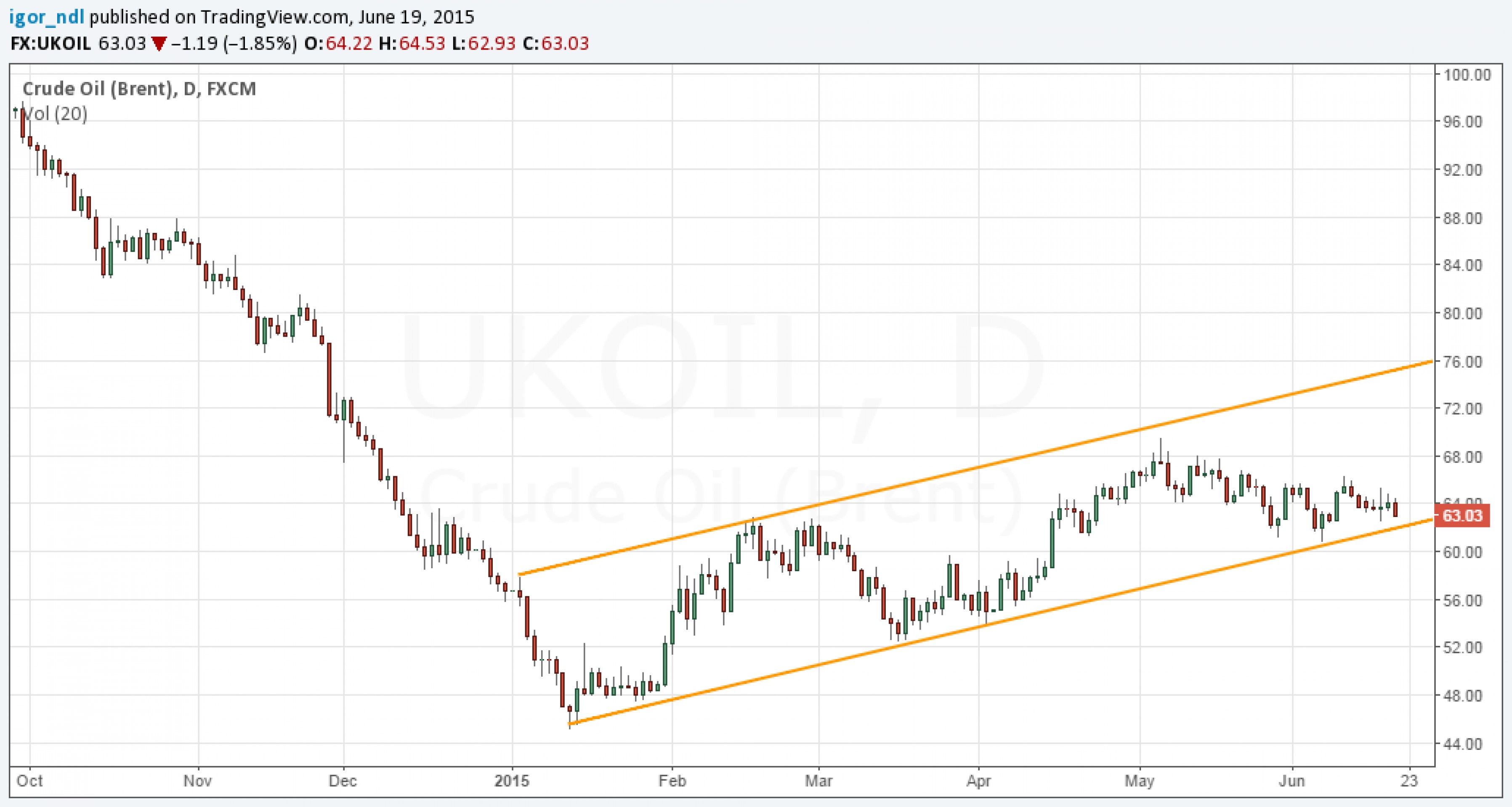 Основным фактором снижения ослабления российской валюты сегодня выступает дешевеющая нефть, что, в принципе, уже давно стало традицией. Мы еще вчера отмечали, что котировки смеси Brent остаются в восходящем канале, но имеют шансы выйти из него вниз, что, конечно, для рубля будет крайне негативным развитием событий. Сейчас, как видно из графика ниже, цена движется к нижней границе этого самого канала.