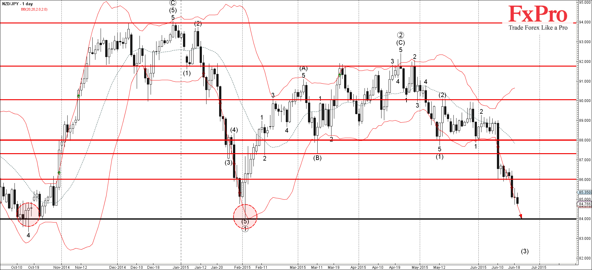 NZD/JPY, скорее всего, продолжит падение в направлении следующей цели для продажи на сильном уровне поддержки 84.00 (который развернул цену в октябре и феврале).