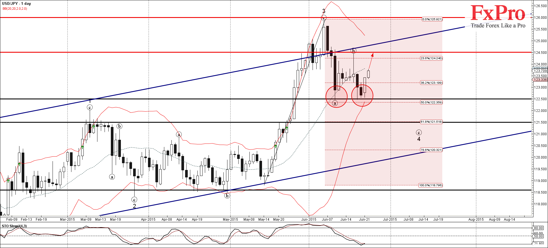 Учитывая, что дневной индикатор Stochastic расположен близко к зоне перепроданности, можно ожидать дальнейшего роста USD/JPY к следующей цели для покупок 124.50 (вершина предыдущей (в)-волны).