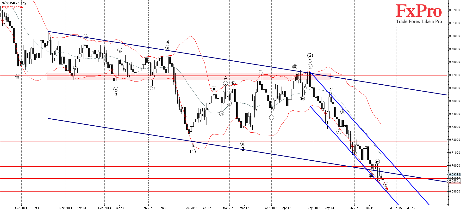 Ожидается, что NZD/USD продолжит падение внутри активной краткосрочной импульсной волны 3 к следующей цели для продажи на уровне поддержки 0.6800 (целевая цена, рассчитанная для завершения импульсной волны 3)