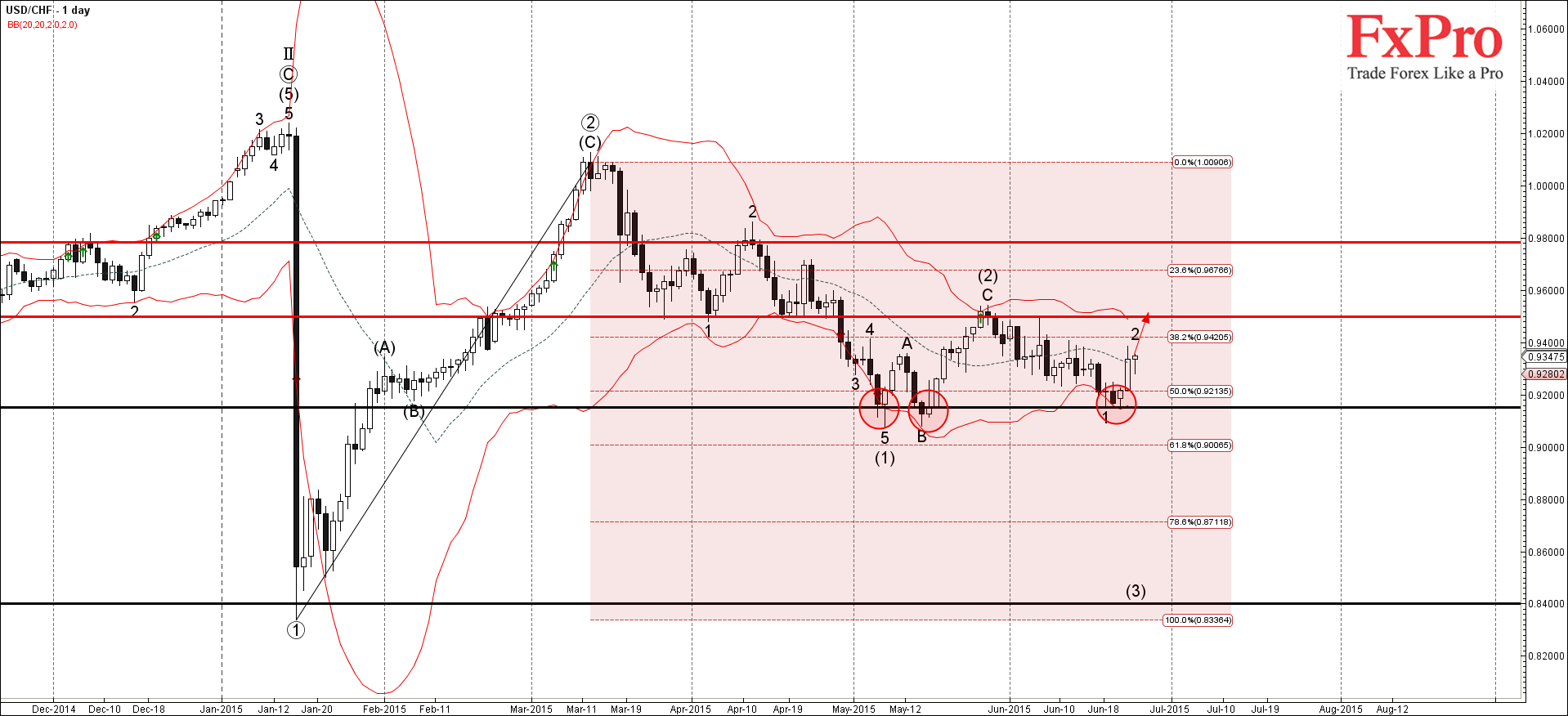USD/CHF недавно развернулся от зоны поддержки лежащей между уровнем поддержки 0.9150, 50% коррекцией Фибоначчи предыдущей резкой долгосрочной коррекционной волны от января ② и нижней дневной полосой Боллинджера.