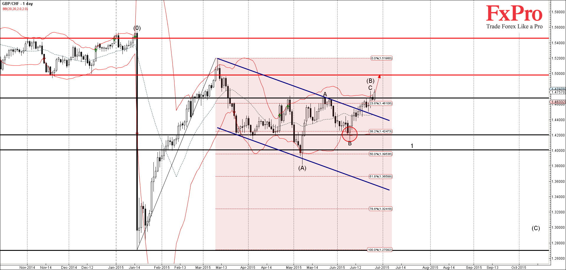 GBP/CHF сегодня прорвал уровень сопротивления 1.4680 (вершина предыдущей A-волны, который несколько раз развернул цену с апреля, как Вы можете видеть ниже).
