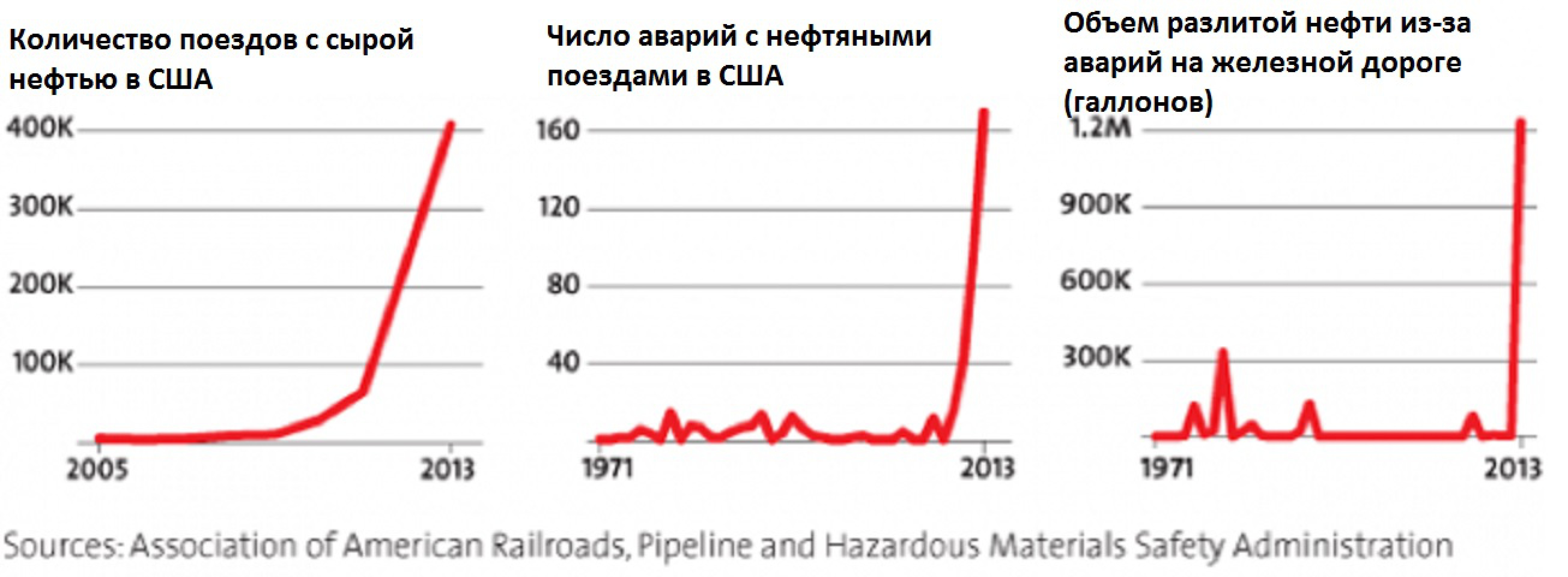 По данным Американской ассоциации железных дорог (American Association of Railroads, AAR), в 2013 г. по железным дорогам США было перевезено в 11 раз больше нефти, чем в период 2005–2009 гг.