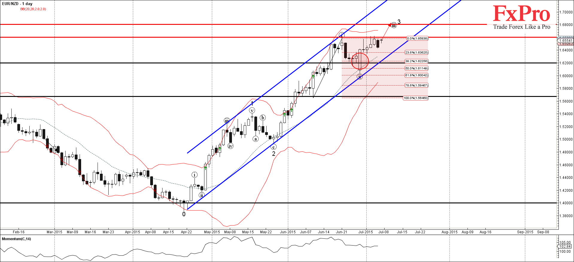 Если пара прорвет уровень сопротивления 1.6600 - EUR/NZD тогда сможет подняться к следующей цели для покупок 1.6800 (прогнозируемая цена для завершения активной импульсной волны (iii)).