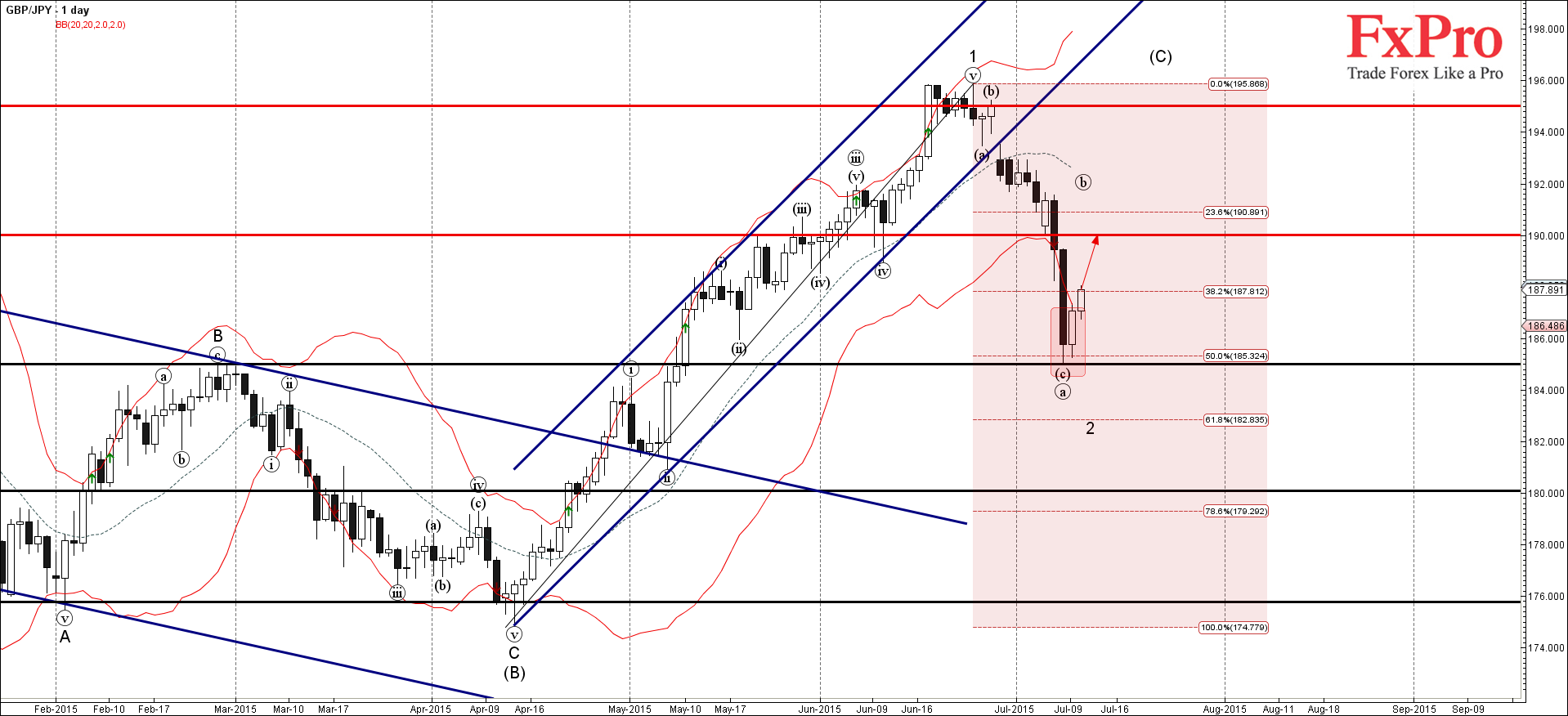 GBP/JPY вчера сильно развернулся от зоны поддержки, расположенной между уровнем поддержки 185.00 (бывшая вершина предыдущей B-волны от февраля) и 50% коррекцией Фибоначчи предыдущей резкой A-волны от апреля.