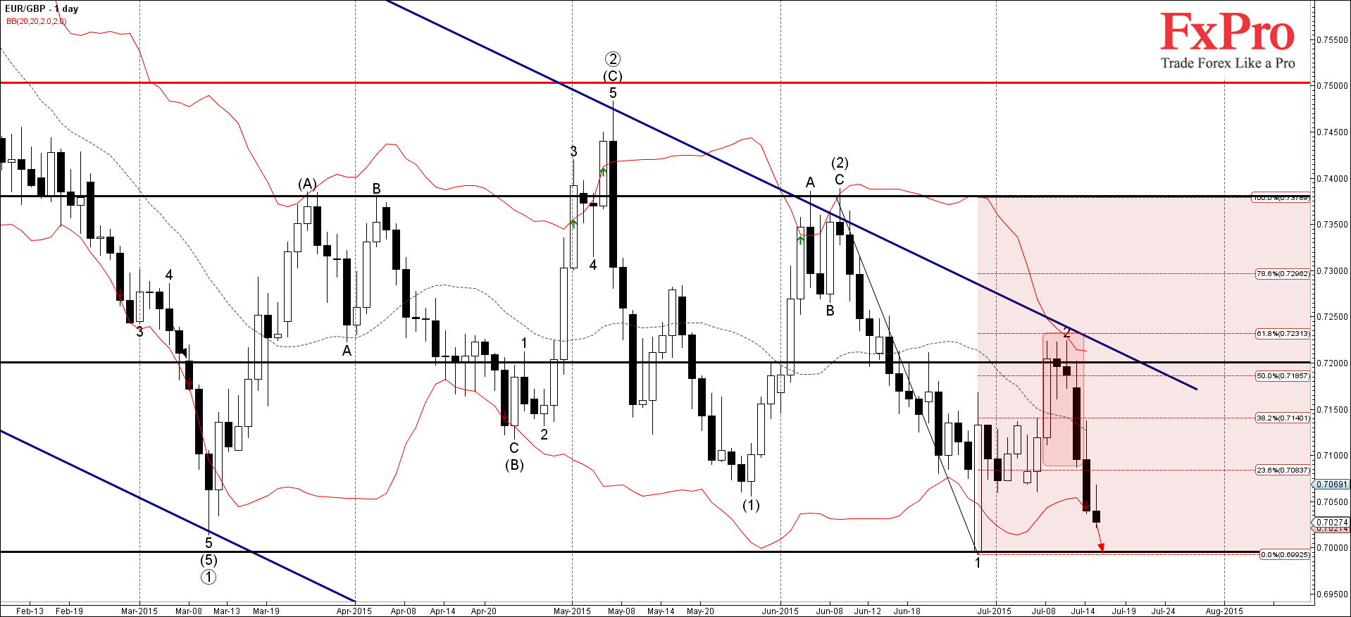 EUR/GBP продолжает падение после недавнего резкого разворота от сильной зоны сопротивления лежащей между уровнем сопротивления 0.7200, 50% коррекцией Фибоначчи импульсной волны 1 и верхней дневной полосой Боллинджера.