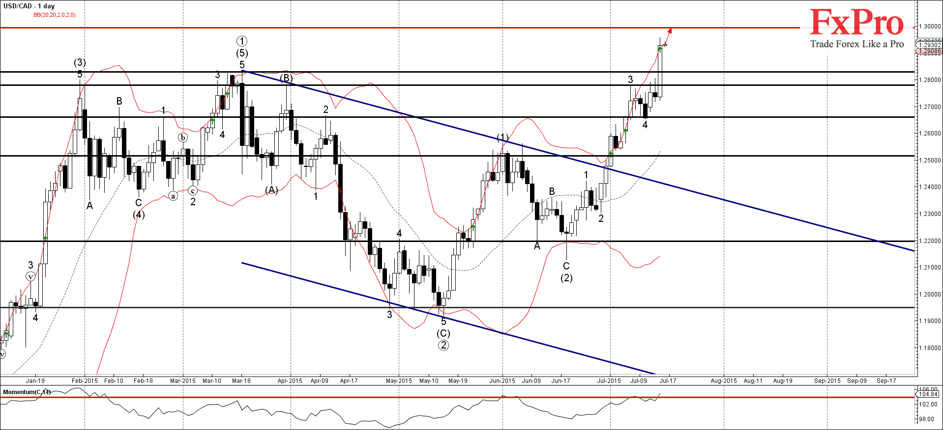 USD/CAD, вероятно, продолжит расти внутри активных импульсных волн 5 и (3) к следующей цели для покупок на круглом уровне сопротивления 1.3000.
