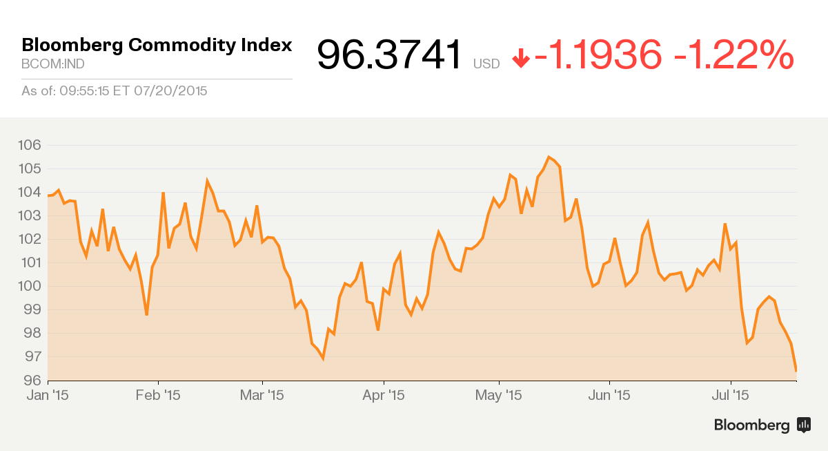 Товарный индекс Bloomberg снизился почти на 1.4%, падая пятый день подряд, что стало длиннейшей чередой снижения с марта. Фьючерсы на стоимость золота снизились до минимального уровня более чем за пять лет, тогда как металлы, используемые в промышленности, зерно, нефть марки Brent и американский природный газ также снижались на фоне роста доллара до максимума с 13 апреля. Сырьевой индекс Bloomberg снизился на 1.3% до 96.2949 к 10:10 по Нью-Йорку после касания 96.1913, что было минимальным уровнем с июня 2002 года. На фоне снижения стоимости сырья падают и акции его производителей. Индекс Bloomberg Intelligence Global Senior Gold Valuation Peers, включающий акции AngloGold Ashanti Ltd. и Newcrest Mining Ltd., обвалился почти на 8.4%.