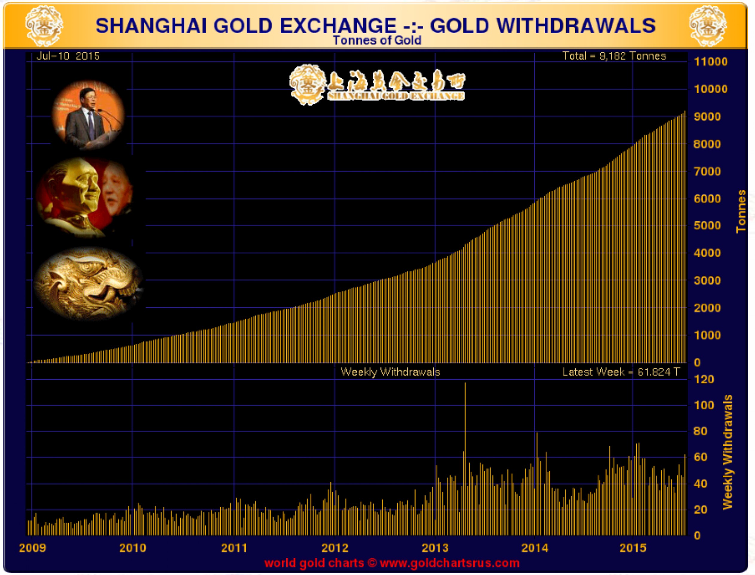 Кроме того, Китай также является активным игроком Шанхайской золотой биржи, которая является важным центром торговли физическим золотом. В 2015 г. через нее было "снято" свыше 1200 тонн в виде физического золота, а с января 2009 г. – более 9 тыс. тонн.