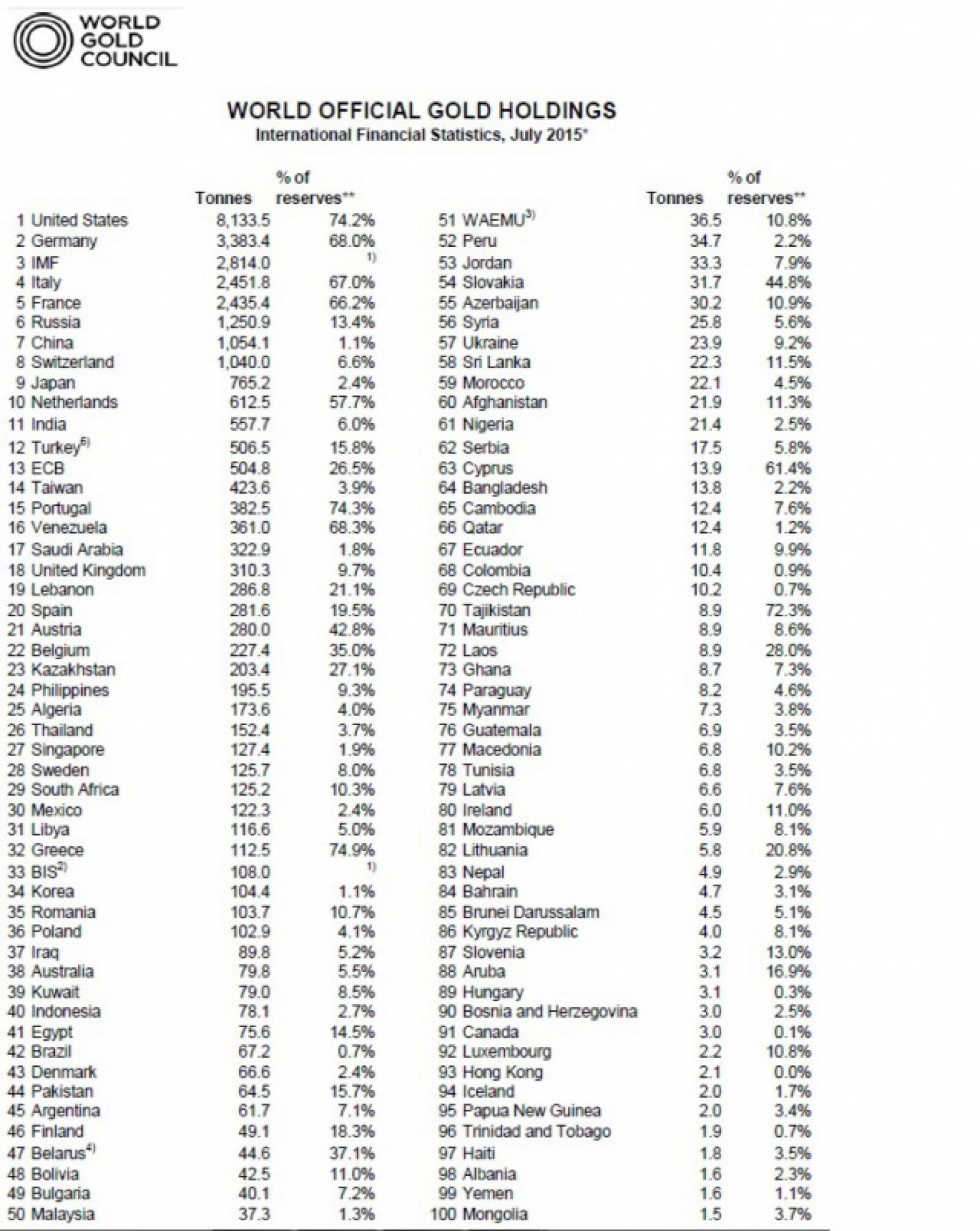 В данной таблице не отражены новые данные по золотым запасам Китая, так как они были опубликованы чуть позднее, чем последний отчет WGC. Напомним, что власти Поднебесной в минувшую пятницу впервые с 2009 г. обнародовали данные о своих золотых резервах. Многие эксперты полагали, что за эти годы КНР увеличила их в разы, но оказалось, что только на 57% до 53,31 млн тройских унций (1658 тонн).