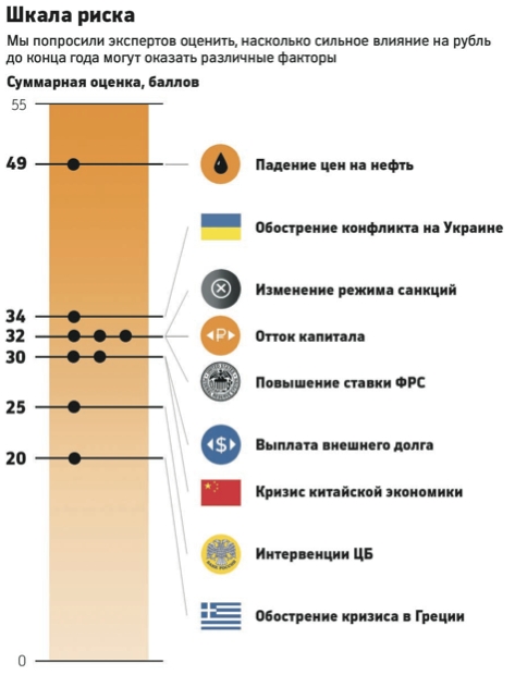 Как и ЦМИ Сбербанка, участники опроса считают, что в первую очередь обвал рубля может быть вызван снижением цен на нефть, которое может начаться в 2016 году. Резкое ослабление рубля может быть вызвано обострением конфликта на Украине и повышением ставки ФРС США. А вот кризис в Греции и обвал фондового рынка в Китае на российский рубль если и повлияют, то несильно.