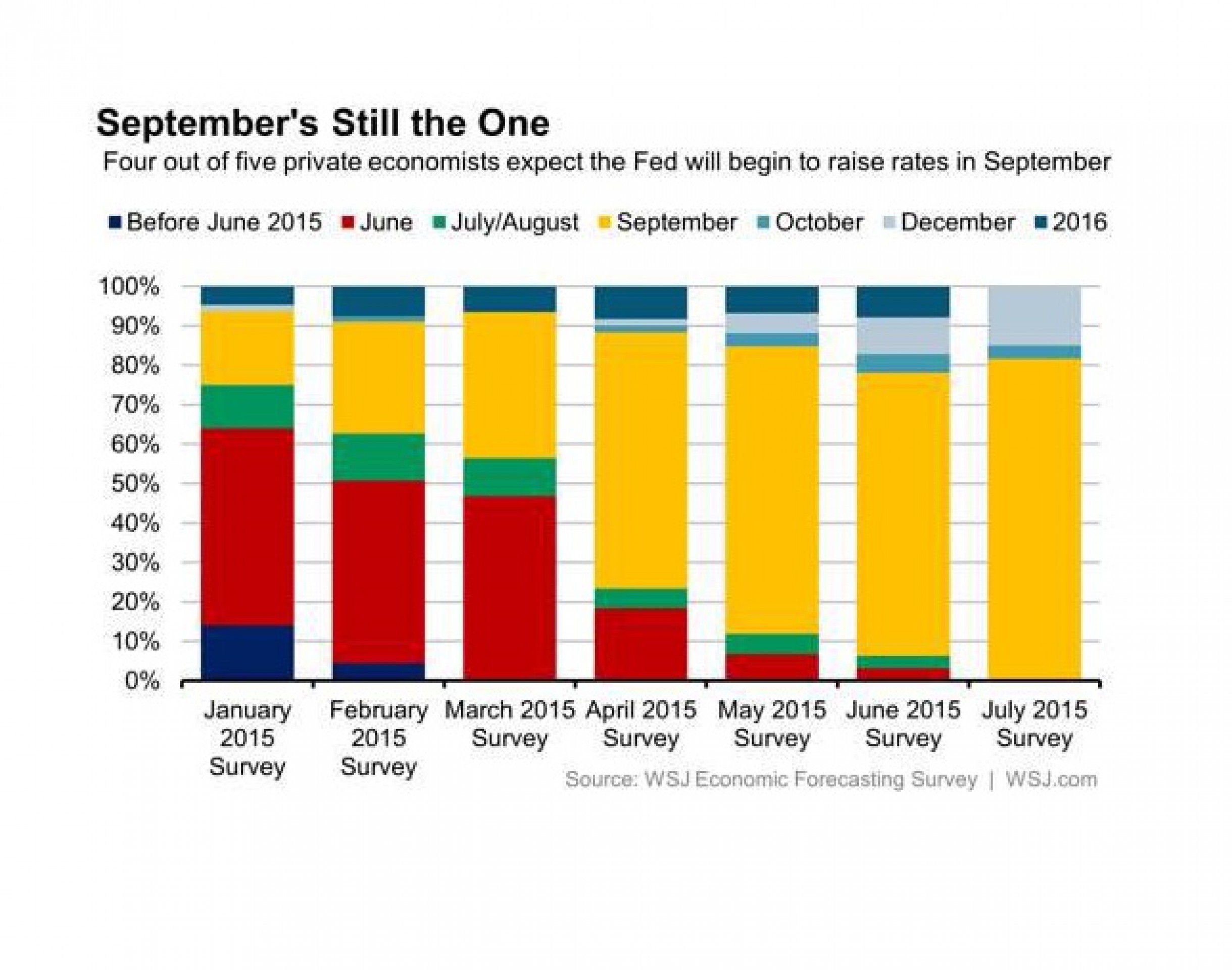 Большинство экспертов сейчас ожидают первого повышения ставок ФРС уже в сентябре этого года - на 25 базисных пунктов. Напомним, заседание Федеральной резервной системы состоится 16-17 сентября. Ниже приведем таблицу, отражающую историю опросов экономистов.