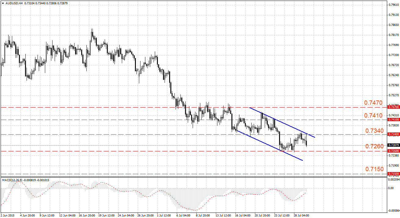 Пара AUD/USD торгуется в нисходящем канале 0.7330 – 0.7225. Значимые уровни Фибоначчи для коррекции 23.6 (0.7310), 38.2 (0.7340), 50.0 (0.7370).