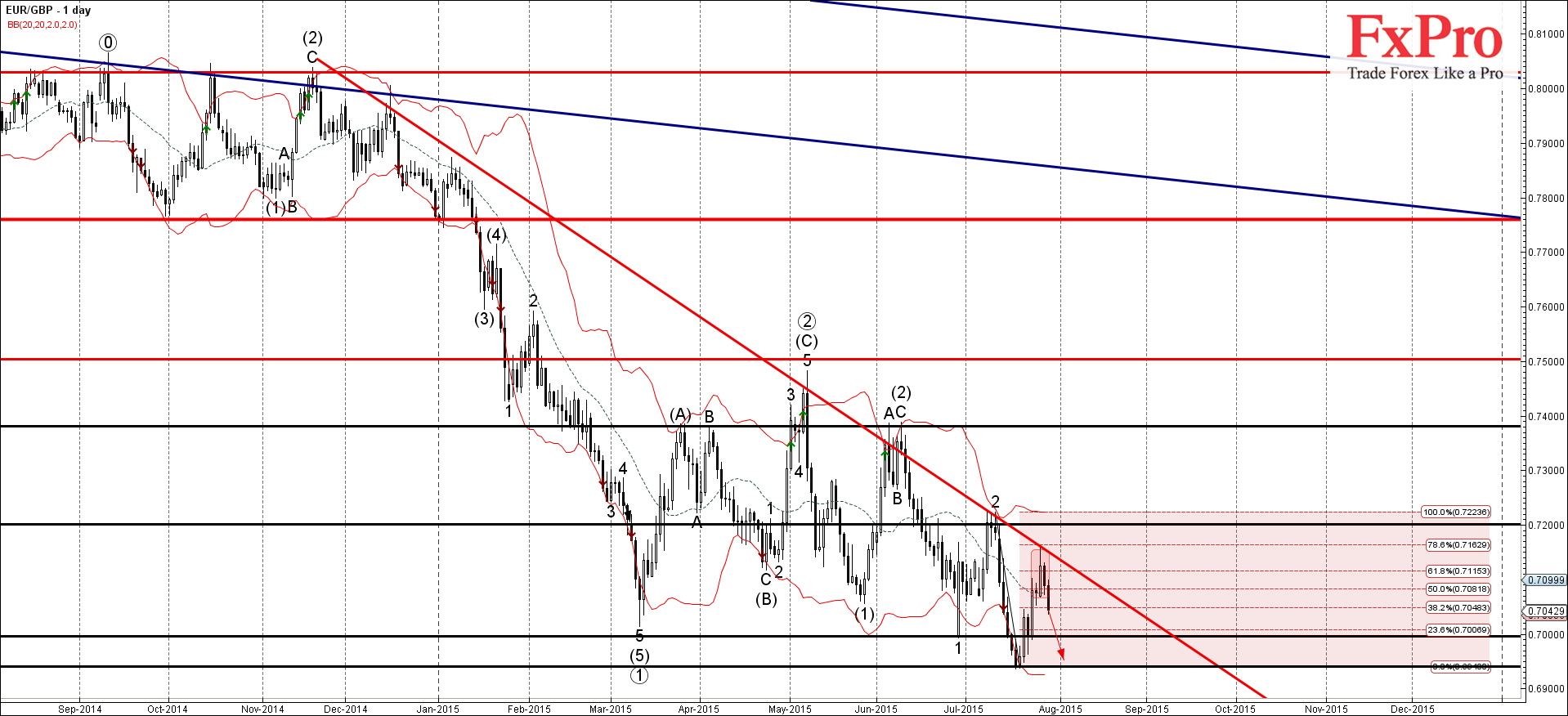 EUR/GBP, скорее всего, продолжит падение в активных импульсных волнах 3 и (3) (которые принадлежат долгосрочной импульсной волне ③ от мая) к следующим целям для продажи 0.7000 и 0.6940.