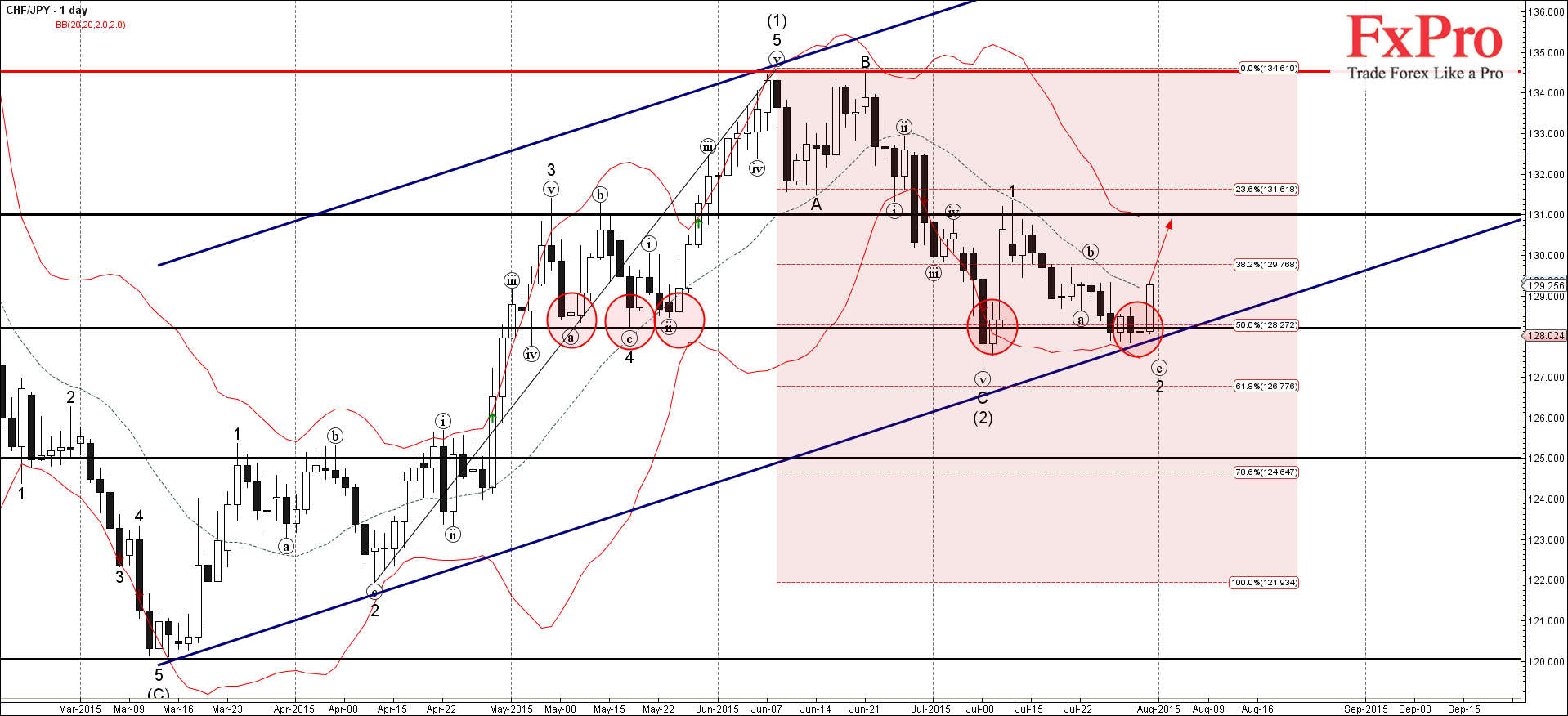 CHF/JPY продолжает расти после недавнего разворота от зоны поддержки лежащей между ключевым уровнем поддержки 128.20 (который несколько раз развернул пару с мая), 50% коррекцией Фибоначчи предыдущего восходящего импульса от апреля и линией поддержки от марта.
