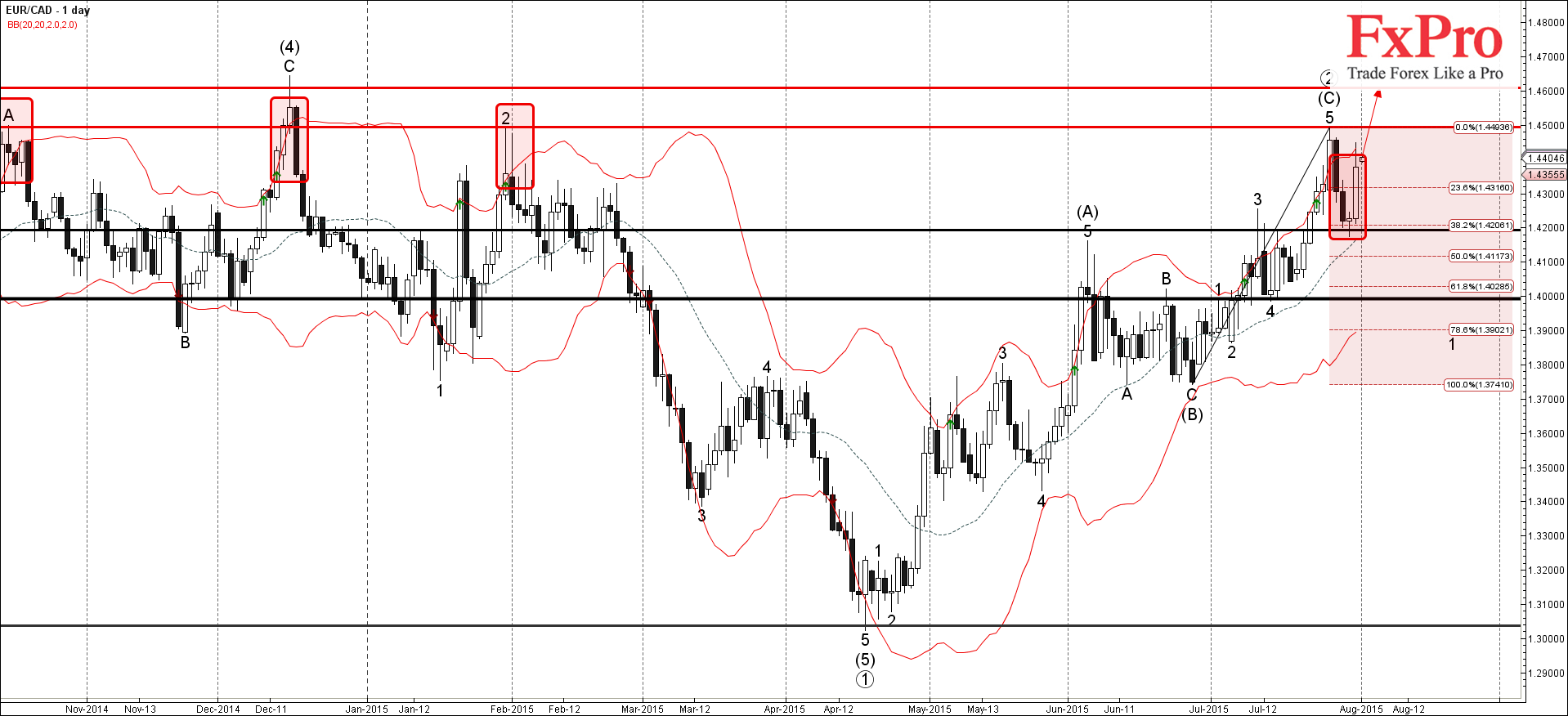 EUR/CAD недавно резко развернулась вверх - после того как пара достигла цели для продажи 1.4200, установленной в нашем предыдущем прогнозе для данной валютной пары.