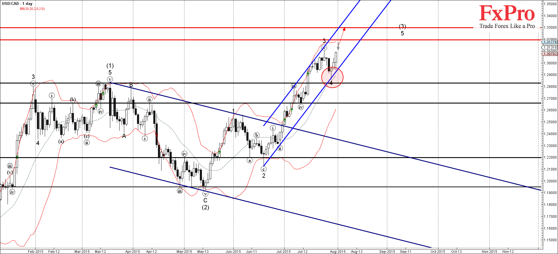 USD/CAD растет в последние несколько торговых сессий и в настоящее время приближается к уровню сопротивления 1.3200, который был установлен в качестве цели для покупок в нашем предыдущем прогнозе на данной валютной пары.