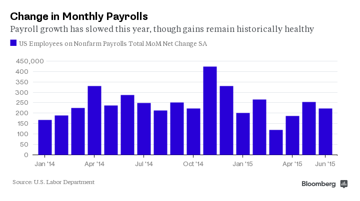 Как прогнозируется, работодатели создали 225k рабочих мест в июле после 223k месяцем ранее, по результатам опроса Bloomberg. С начала года занятость росла в среднем на 208k каждый месяц.