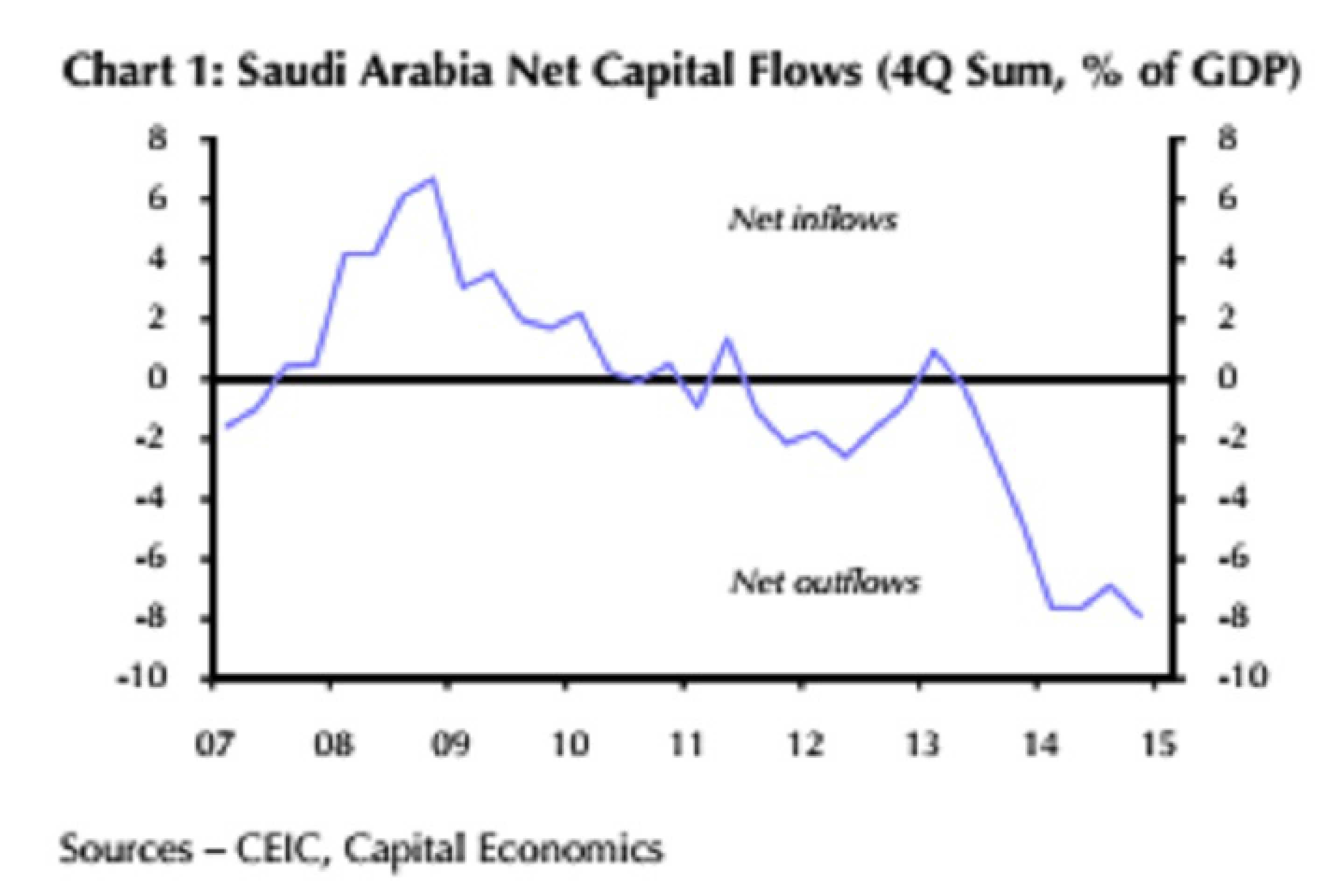 После Арабской весны Саудовская Аравия столкнулась с оттоком капитала в размере 8% ВВП ежегодно. Резервы упали с $737 млрд до $672, то есть они сокращаются примерно на $12 млрд в месяц.