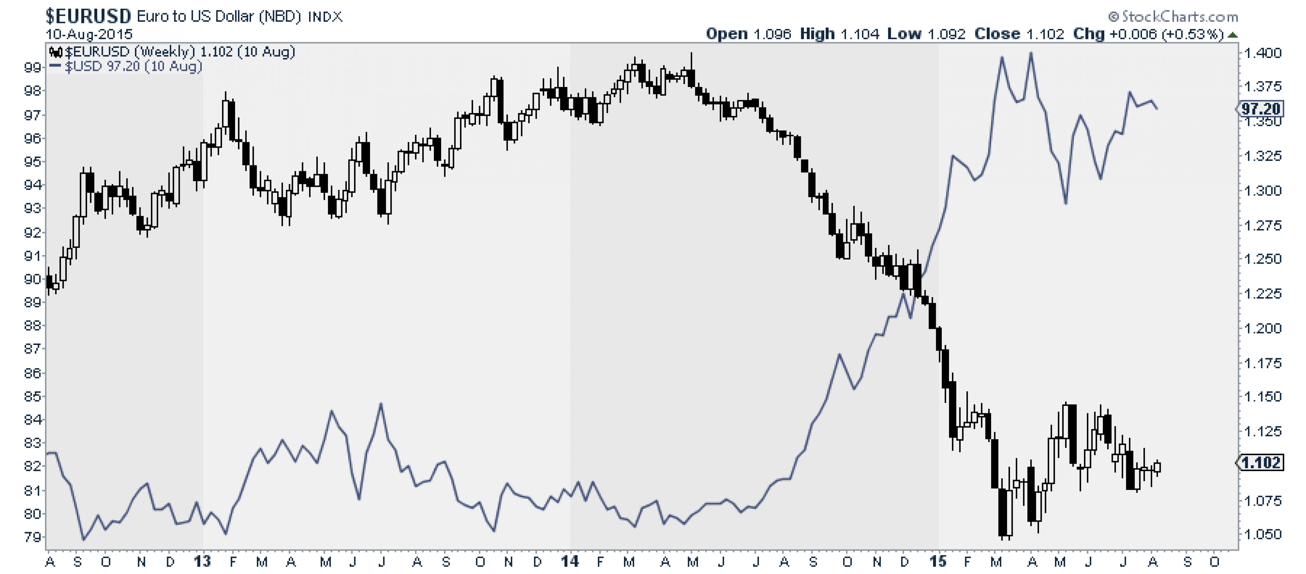 Как будет показано на графике ниже, медленный устойчивый рост доллара совпадает с периодами роста экономики США. Это легко объясняется, ведь сильная экономика привлекает к себе все больше и больше инвестиций. Тем не менее на определенной стадии рост доллара становится губительным для экспортеров, и в экономике наступает спад.