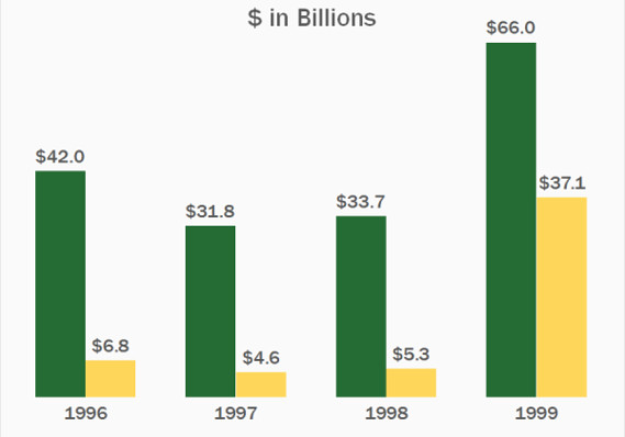 За 4-летний период по декабрь 1999 года, на рынок вывели свои акции 1,908 компаний. Всего несколько лет спустя этот показатель упал на 90%.