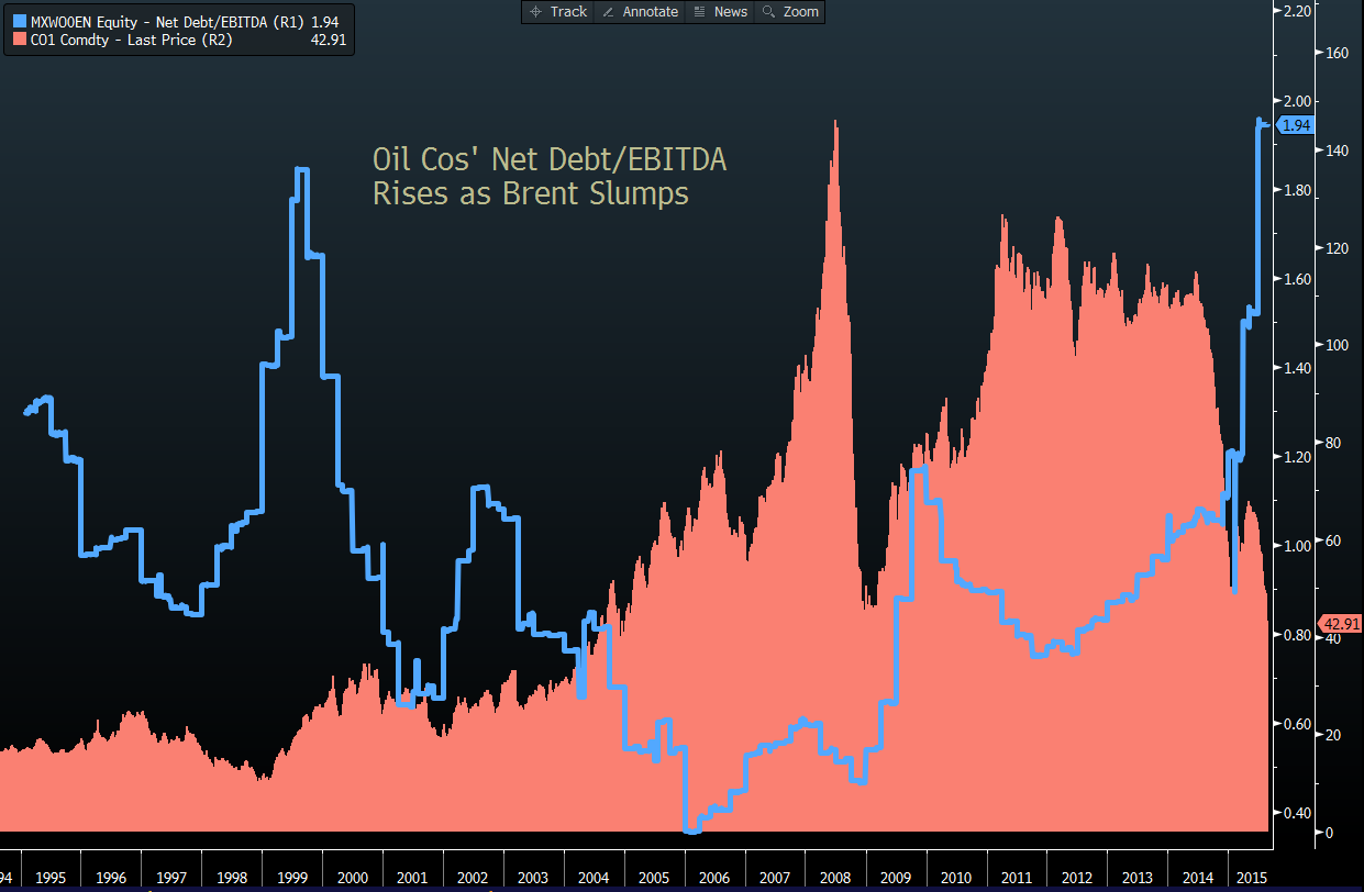 Во времена, когда стоимость нефти оказалась на минимальном уровне за шесть лет, производителям понадобится найти полтриллиона долларов, чтобы погашать свои долги. Количество облигаций нефтяных и газовых компаний с доходностью в 10% и более, утроилось за прошедший год. Соотношение долга к прибыли на максимуме за два десятилетия.